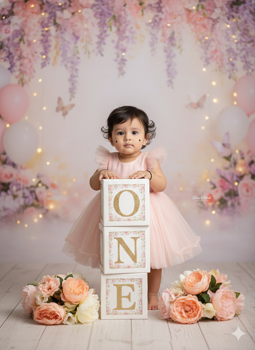 A dreamy first birthday studio photoshoot of a cute baby girl standing and gently leaning on three stacked decorative blocks spelling “ONE”. The baby is wearing a soft pastel pink fluffy tulle dress with ruffled sleeves, barefoot, with small traditional black kajal dots on her face. She looks calmly toward the camera with an innocent expression. The blocks are white with floral borders and elegant golden letters. Surrounding the blocks are pastel flower arrangements in peach, blush, and cream tones. Background is a magical fantasy floral setup with hanging lavender and pink flowers, soft fairy lights, butterflies, pastel balloons, and misty bokeh effects. Elegant indoor studio setting with wooden floor, soft diffused lighting, shallow depth of field, warm tones, ultra-realistic baby photography, fine art style, high detail, 4K resolution, soft dreamy atmosphere. Note : Don’t Change The Upload Photo Faces