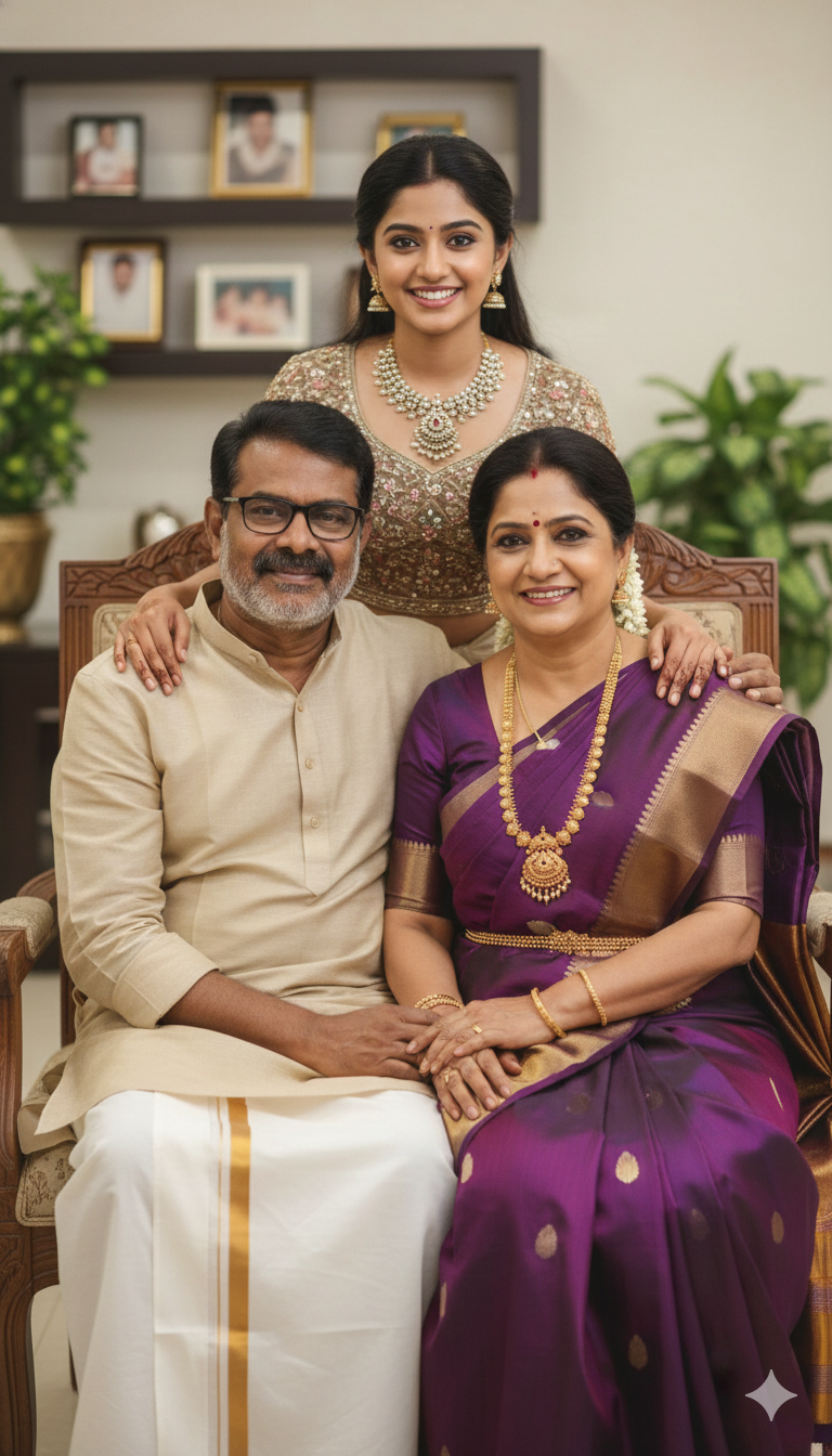 A warm, candid Indian family portrait of three people indoors. An elderly couple sitting close together on a wooden chair, smiling naturally at the camera. The father wearing a light beige kurta and dhoti with glasses and a mustache, the mother wearing a rich purple silk saree with silver border and traditional jewelry. Their daughter standing behind them with her arms lovingly around their shoulders, wearing an elegant embroidered festive blouse with statement necklace and mehndi on hands. Soft indoor lighting, shallow depth of field, creamy bokeh background with plants and home decor, warm tones, sharp focus on faces, natural skin tones, professional photography, 85mm lens, f/2.0, high detail, cinematic color grading, wedding/family celebration vibe.