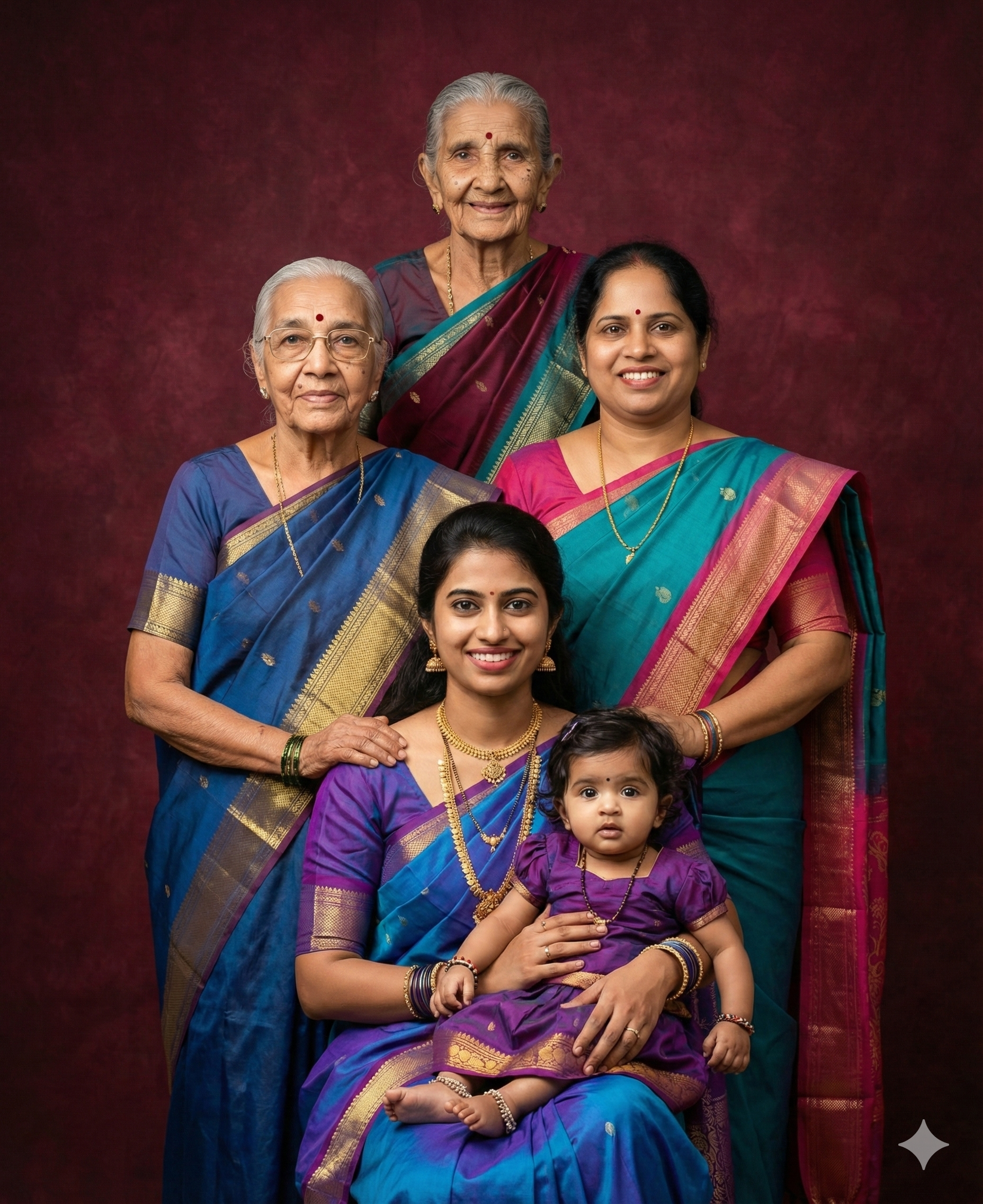 A heartwarming multi-generation Indian family portrait featuring five generations of women arranged vertically in a traditional pose. At the top stands an elderly great-grandmother with grey hair tied back, wearing a deep maroon and teal silk saree, gentle smile and calm expression. Below her is a grandmother in a blue silk saree with a gold border, smiling warmly. Beneath her stands a middle-aged woman in a teal and pink silk saree, joyful expression. Seated in front is a young mother wearing a vibrant blue and purple silk saree with traditional gold jewelry, holding a baby girl in a purple traditional dress on her lap. All women are wearing bindis and minimal traditional gold jewelry. The baby has expressive eyes and traditional anklets. Studio portrait setup with a rich maroon textured backdrop, soft diffused lighting, warm skin tones, natural smiles, high realism, sharp focus, professional photography, 85mm lens look, shallow depth of field, cinematic composition, ultra-high resolution, cultural Indian family emotion, timeless heritage portrait. Note : Don’t Change The Upload photo faces