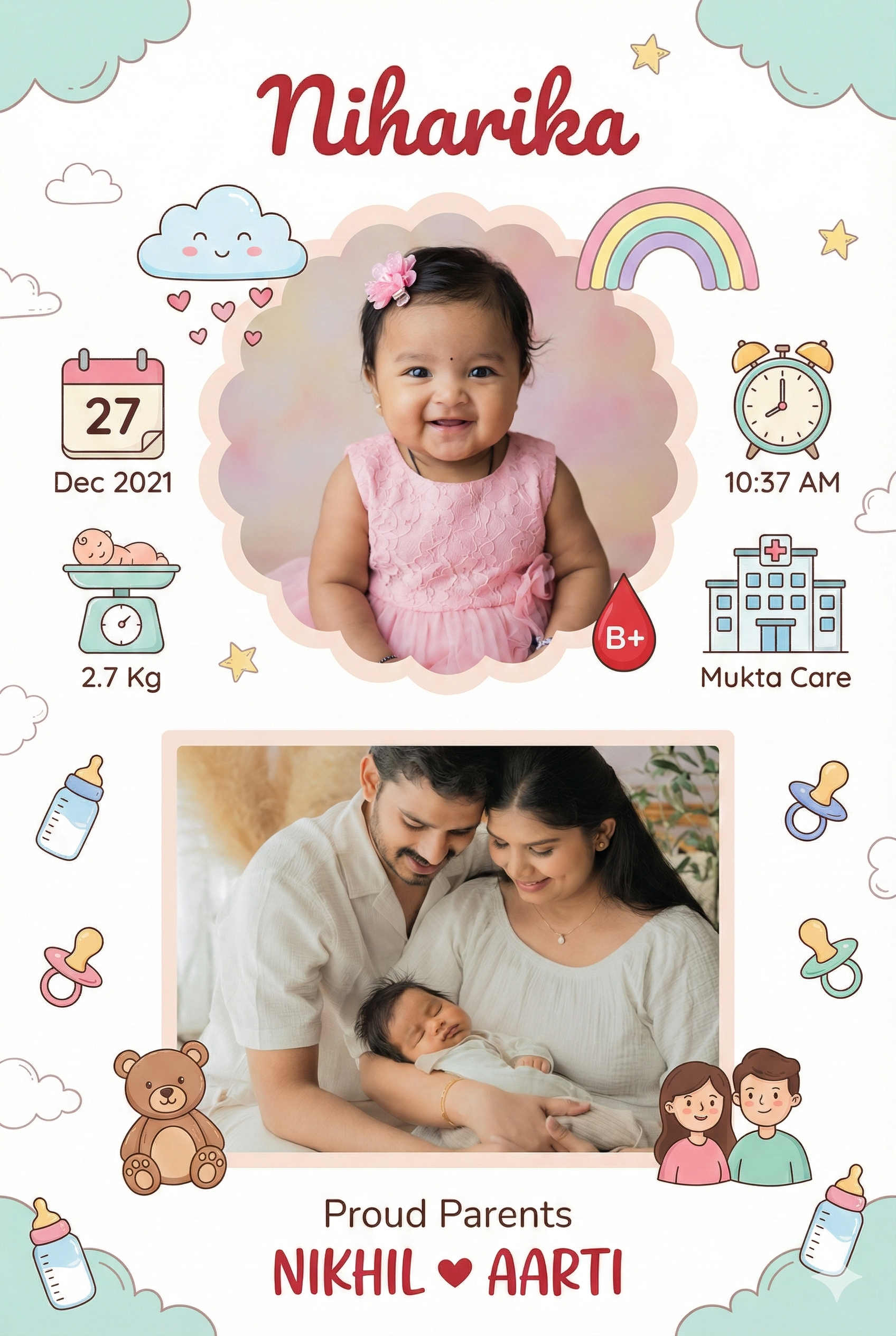 A cute and elegant baby birth announcement poster in vertical frame layout. White pastel background with soft doodle illustrations. At the top, the baby name “Niharika” written in a stylish red handwritten font. Center top features a smiling Indian baby girl wearing a pink dress and hair clip, placed inside a soft scalloped circular frame. Surrounding icons include a cute cloud with hearts, a colorful rainbow, a calendar icon showing date “27 Dec 2021”, an alarm clock icon showing time “10:37 AM”, a weighing scale icon with text “2.7 Kg”, a blood drop icon with blood group “B+”, and a hospital building icon labeled “Mukta Care”. Below the baby photo, a rectangular photo of proud Indian parents hugging lovingly, warm emotional tone. Under the photo, text reads “Proud Parents” followed by “NIKHIL ❤️ AARTI” in bold red font. Cute baby-themed illustrations like a teddy bear and cartoon couple placed neatly around the frame. Soft lighting, pastel color palette, high-resolution printable poster, clean typography, modern baby announcement design, realistic photos blended with flat vector icons.