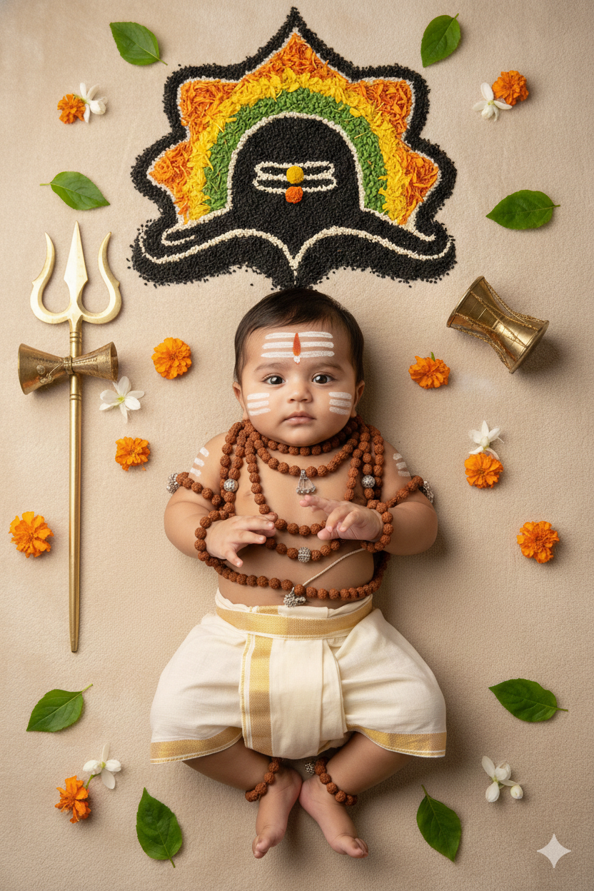 Above the baby, a large decorative Shivling artwork made from flowers and grains (black, green, yellow, orange petals), with trishul and damru placed artistically. Fresh green leaves and white flowers scattered around for a festive devotional look.