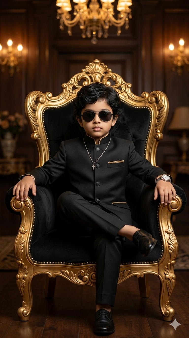 A young boy sitting confidently on a luxurious black royal throne chair, wearing a stylish all-black traditional outfit with subtle gold borders, modern black shoes, and a wristwatch. His pose is calm and powerful, one leg crossed over the other, hands resting on the armrests. The background features a rich, vintage royal interior with dark wooden panels, warm golden ambient lighting, and soft blurred wall decor. Cinematic lighting with soft shadows, dramatic mood, ultra-realistic skin texture, sharp focus on face, shallow depth of field, high detail, 8K resolution, professional studio portrait, symmetrical composition, moody tones, premium royal aesthetic, HDR, photorealistic.