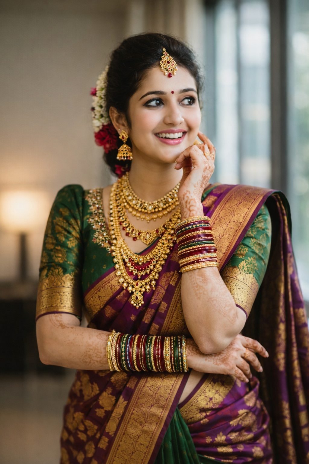 Beautiful young Indian woman wearing a traditional green and purple silk saree with rich golden zari border, heavy bridal gold jewelry, layered necklaces, bangles in green and red, maang tikka, earrings, small red bindi, neatly tied bun hairstyle decorated with flowers, smiling joyfully, candid expression, indoor setting with soft natural light, blurred modern window background, shallow depth of field, ultra-detailed, high resolution, cinematic portrait photography, 85mm lens, f1.8 aperture, sharp focus on face, vibrant colors, professional color grading, realistic skin tones, elegant Indian wedding look