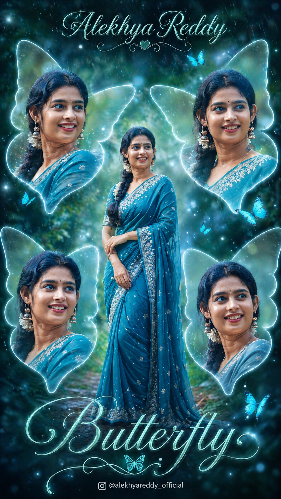 A beautiful young Indian woman wearing an elegant teal blue saree with silver embroidery, long braided hair over shoulder, traditional jhumka earrings, soft natural makeup, smiling expression. Create a dreamy cinematic collage with multiple portraits of the same woman arranged symmetrically (5 poses: center full-body and surrounding close-up angles). Add glowing butterfly-shaped transparent frames around each portrait with soft light edges.