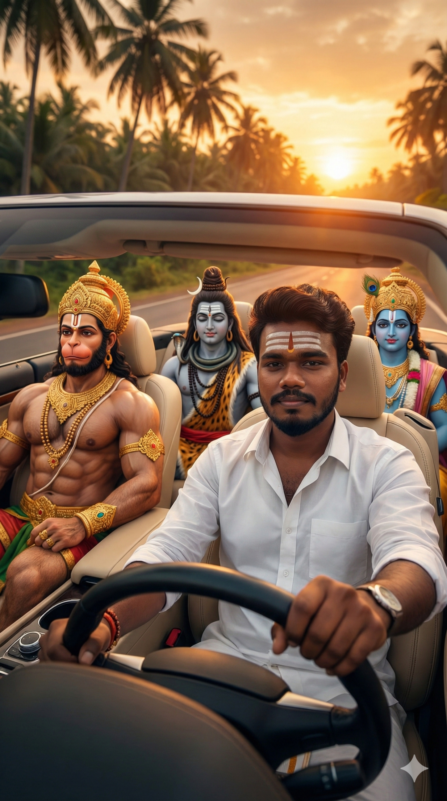 A cinematic, ultra-realistic scene of a modern Indian young man driving a luxury convertible car during golden hour sunset. He is wearing a white shirt, calm and confident expression, vibhuti (sacred ash) on his forehead. Inside the car behind him sit Hindu mythological characters — Hanuman with a muscular body and golden ornaments, Lord Shiva with ash marks and serene face, and Lord Krishna with blue skin, crown, and divine jewelry. The car interior is premium beige leather. Background features palm trees, tropical road, and a warm sunset sky with soft orange and golden tones. Cinematic lighting, shallow depth of field, hyper-realistic details, sharp focus, dramatic composition, 8K resolution, high dynamic range, realistic skin textures, divine aura, modern-mythology fusion style, photorealistic, professional photography look.