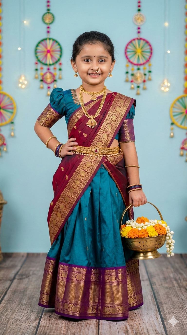 A cute young Indian girl wearing a traditional half-saree (Langa Voni) outfit, teal blue skirt with a rich purple and gold border, maroon draped dupatta with gold zari work, puff sleeve blouse, small gold earrings and bangles, tiny black bindi, long neatly tied hair, smiling confidently, one hand on her waist and holding a traditional brass flower basket in the other hand, full body portrait, standing on a textured floor, soft pastel blue studio background with colorful circular festive wall decorations, shallow depth of field, soft natural lighting, vibrant colors, ultra-detailed, high resolution, professional portrait photography, 85mm lens, f/1.8, cinematic look, sharp focus, traditional Indian cultural portrait. 9:16 ratio and Add Jewellery on palces
