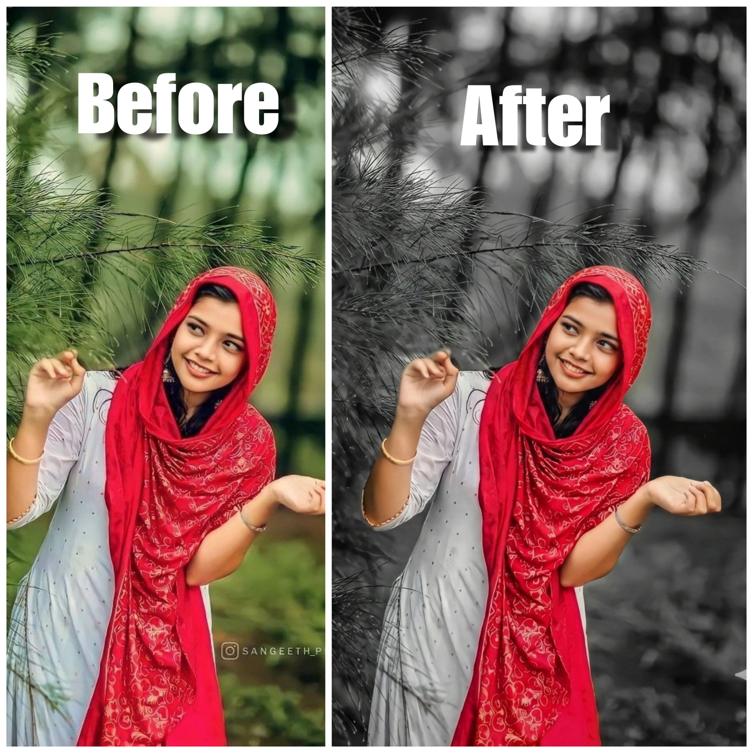 Prompt:”Create a cinematic portrait with selective color grading effect. Subject wearing a bright red blouse and teal saree in sharp focus, while the entire background and surroundings are desaturated to black and white. High contrast, soft matte finish, muted grey tones in background, warm natural skin tones. Moody atmosphere, shallow depth of field, creamy bokeh, sharp details on face, soft blurred trees and grass. Dramatic lighting, subtle vignette, HDR look, professional photography, 85mm lens, f/1.8, ultra realistic, high resolution, Instagram cinematic tone.”🔥 If You Are Using Lightroom / Camera Raw Add These Settings:Exposure: +0.3Contrast: +20Highlights: -40Shadows: +25Texture: +10Clarity: +15Vibrance: +20Saturation: -40 (then use masking on subject to bring back colors)Color Grading:Shadows: Slight cool blueMidtones: NeutralHighlights: Warm orangeIf you want, I can also give you CapCut / Snapseed version settings sign @sandyeditz