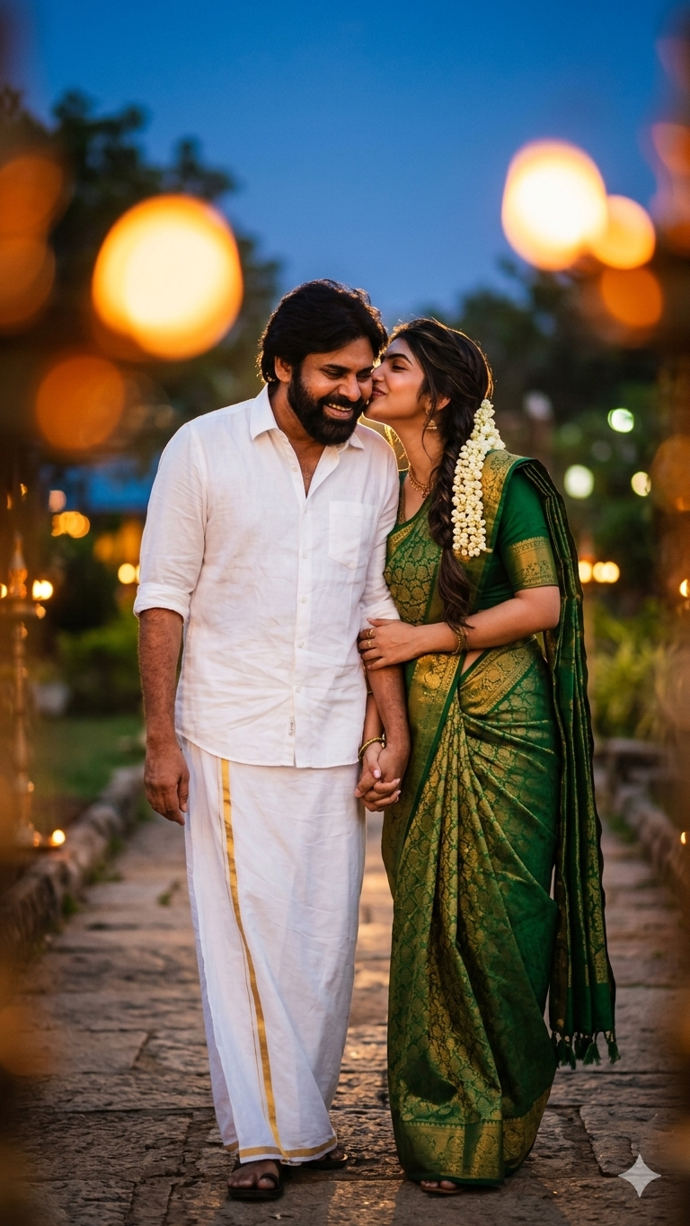 A romantic South Indian couple walking together, smiling at each other with love, the woman wearing a traditional green silk saree with golden patterns and jasmine flowers in her hair, the man wearing a white shirt and traditional dhoti (lungi), both looking happy and natural, warm golden cinematic lighting, glowing orange and blue bokeh background, soft focus, dreamy atmosphere, evening time, high detail skin texture, realistic faces, shallow depth of field, 85mm lens, ultra HD, vibrant colors, filmic color grading, romantic mood, slight motion blur, professional photography, sreeela and powan klayan sreeela kissing the pspk
