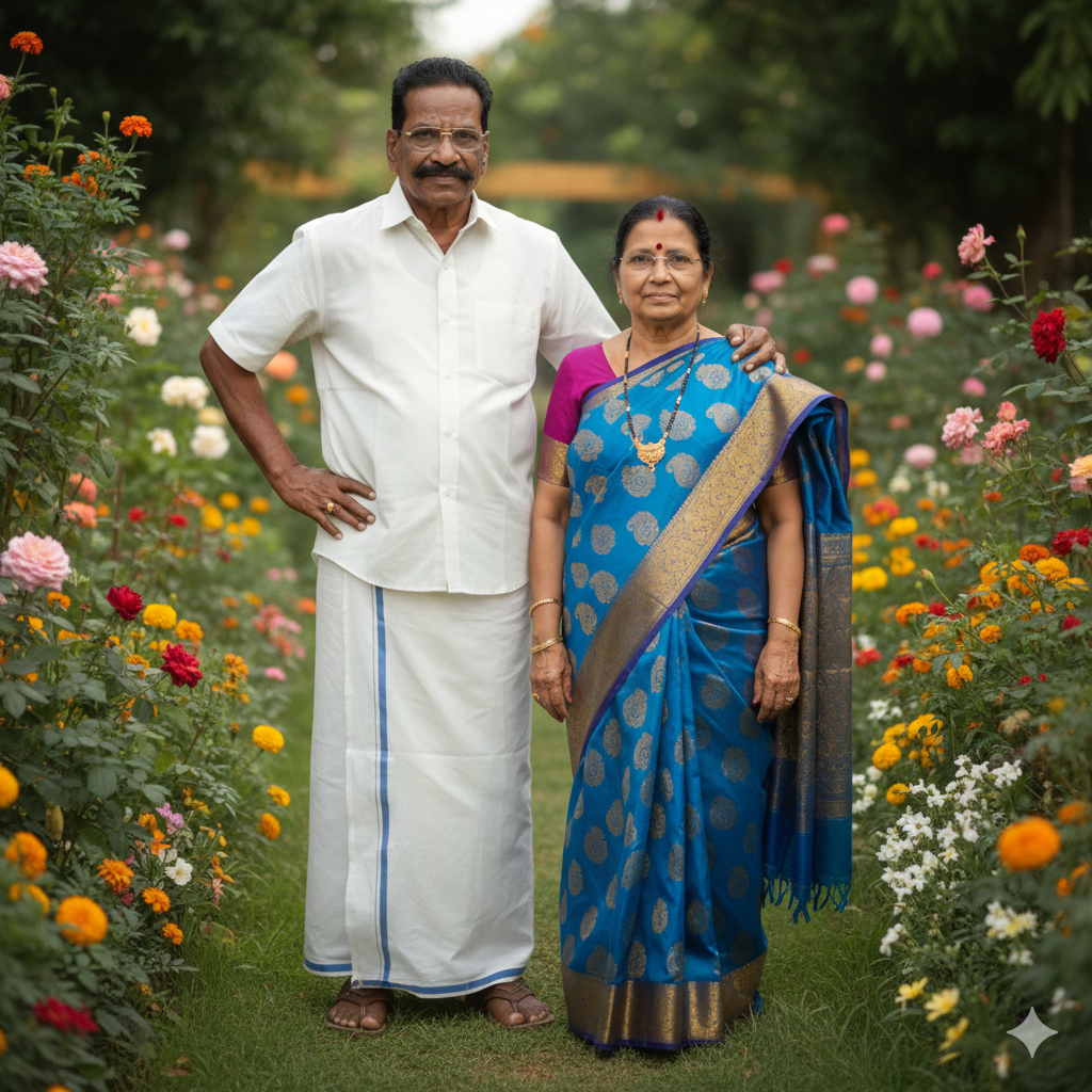 Realistic portrait photo of an elderly Indian couple standing together outdoors in a garden. The man is wearing a white short-sleeve shirt and white pants, glasses, and sandals, with one hand on his hip and the other arm around the woman. The woman is wearing a blue silk saree with gold border, traditional jewelry, and glasses. Natural greenery background with flowers, soft natural daylight, high detail, DSLR quality, sharp focus, realistic skin texture, 4K, professional photography style.” 9:16 ratio
