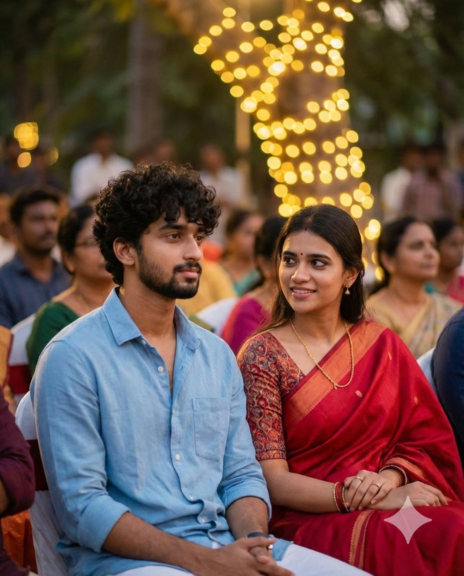 ME OUTDOOR EVENT. THE YOUNG MAN ON THE LEFT HAS DARK, WAVY HAIR AND A SUBTLE BEARD, WEARING A CASUAL LIGHT BLUE BUTTON-DOWN SHIRT: HE IS LOOKING SLIGHTLY FORWARD. THE YOUNG WOMAN NEXT TO HIM HAS DARK HAIR, WEARING A VIBRANT RED SAREE WITH A PATTERNED BLOUSE, GOLD NECKLACE, AND BANGLES: SHE