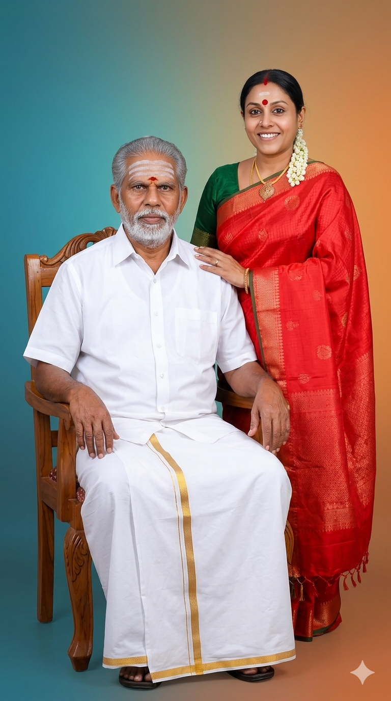A traditional Indian couple studio portrait, an elderly man seated on a carved wooden chair wearing a white shirt and white dhoti with a golden border, grey hair and full beard with sacred ash (vibhuti) and red tilak on forehead, calm dignified expression. A middle-aged Indian woman standing beside him with one hand gently resting on his shoulder, wearing a bright red saree with a green blouse, traditional jewelry, bindi, simple elegant look. Clean studio background with smooth gradient blend of teal blue and warm orange tones. Soft diffused lighting, sharp focus, ultra-realistic skin texture, 8K resolution, symmetrical composition, cultural authenticity, highly detailed, professional photography, no pose change, same face preservation. 9:16 Ratio