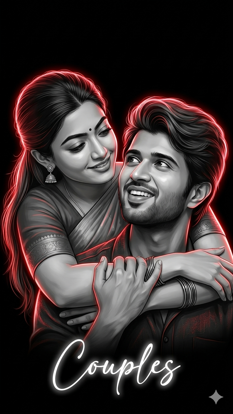 Add subtle red highlights on clothing and hair strands, with high contrast lighting and sharp details. Background should be completely black for strong subject focus. At the bottom, include stylish handwritten Couples text in glowing white color.