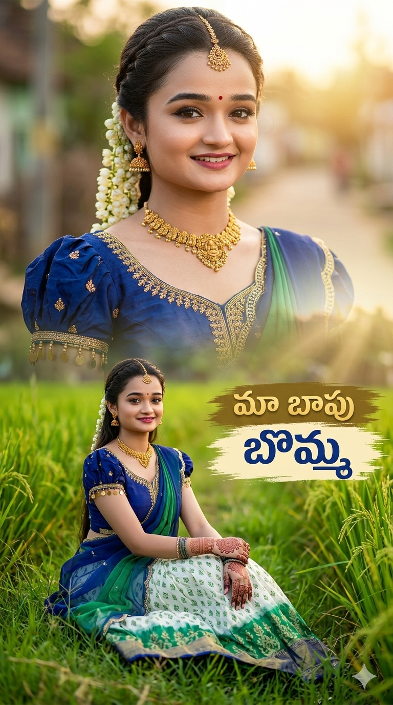 Note : Middle Right Side Brush Stroke effect Telugu text Middle Text మా బాపు Big Text బొమ్మ colour different