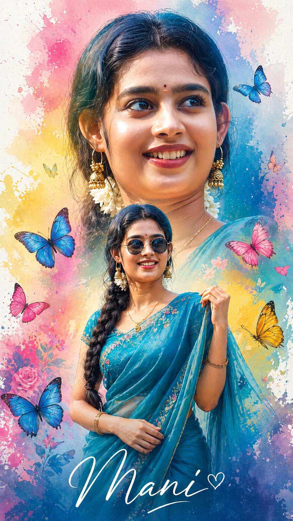 Background: colorful watercolor splash effect blending pink, yellow, and blue hues with soft edges and artistic paint texture. Add multiple realistic butterflies (blue, pink, yellow) flying around the subject for a dreamy aesthetic.