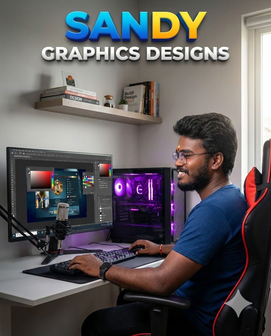 A realistic modern workspace scene of a young Indian male graphic designer sitting on a black and red gaming chair, working on a desktop computer in a stylish home office. Side profile view. He is using a keyboard and mouse, smiling slightly while editing in professional design software (color palette and UI visible on screen). RGB gaming PC cabinet glowing with purple lights beside the monitor. A condenser microphone on desk. Clean minimal wall background with floating shelf, books, and small decor items. Soft cinematic lighting, sharp focus, high detail, professional photography, 4K resolution, depth of field, modern creative studio vibe.
