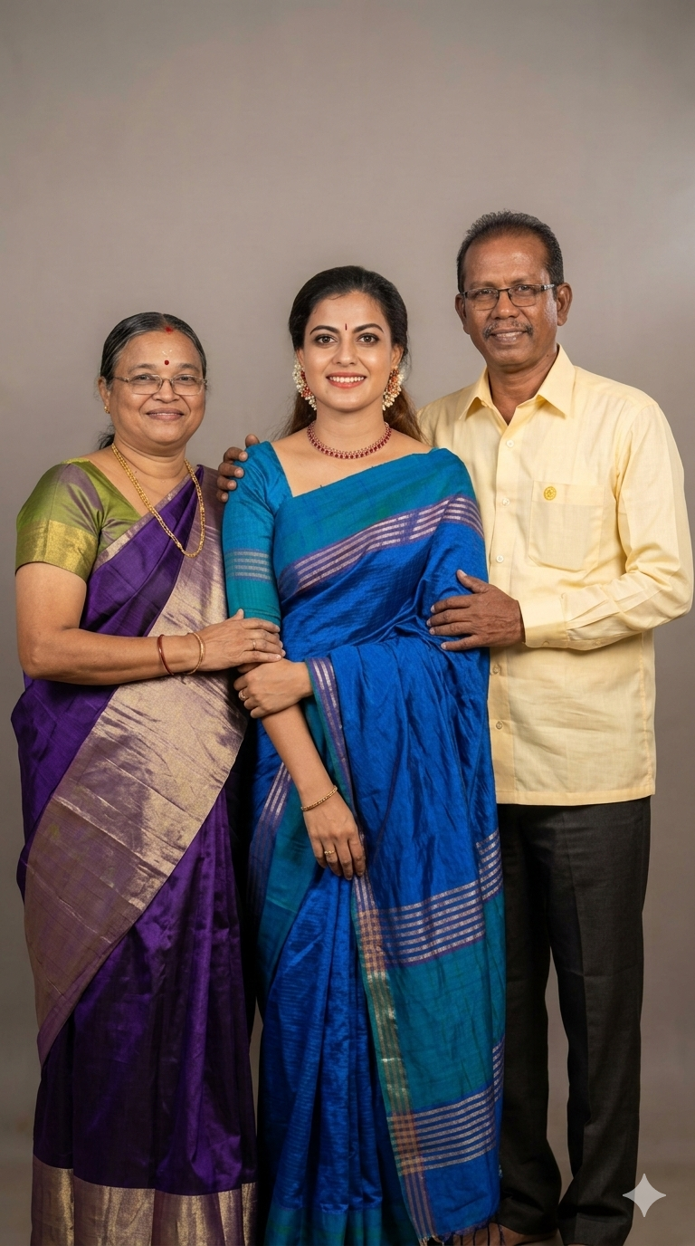 They are standing close together like a loving family, natural smiles, warm expressions, gentle poses. Studio portrait composition, soft professional lighting, neutral elegant background, high detail skin texture, traditional Indian family look, realistic photography style, 85mm lens, shallow depth of field, ultra-realistic, high resolution.
