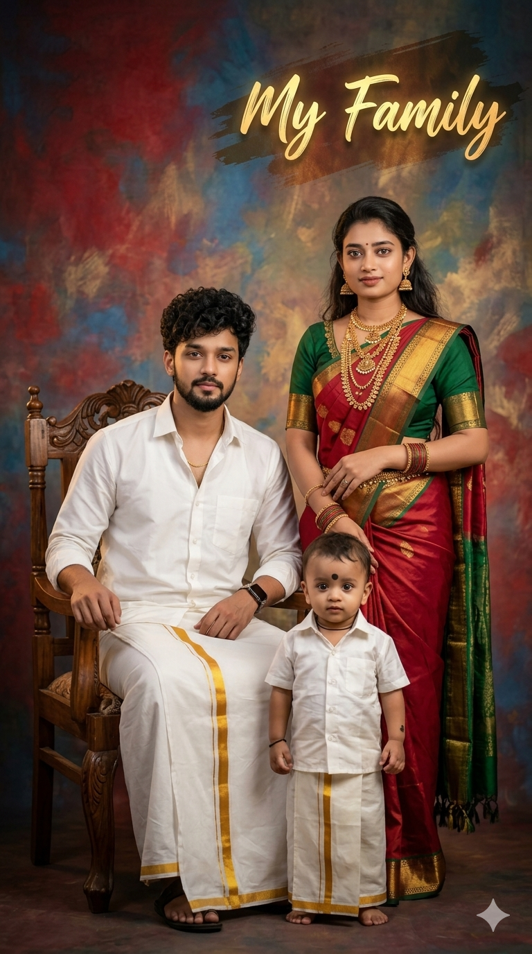 A traditional South Indian family portrait with a cinematic studio setup. A young man is seated on an antique carved wooden chair, wearing a crisp white shirt and traditional white dhoti with golden border, minimal gold chain and watch, neatly groomed beard and curly hair, calm confident expression. A woman stands beside him, wearing a rich red and green silk saree with gold zari border, heavy traditional gold jewelry including layered necklaces, bangles, earrings, and a small bindi, elegant posture and serene expression. A small child stands in front, wearing a white shirt and traditional dhoti with golden border, looking innocent and composed.