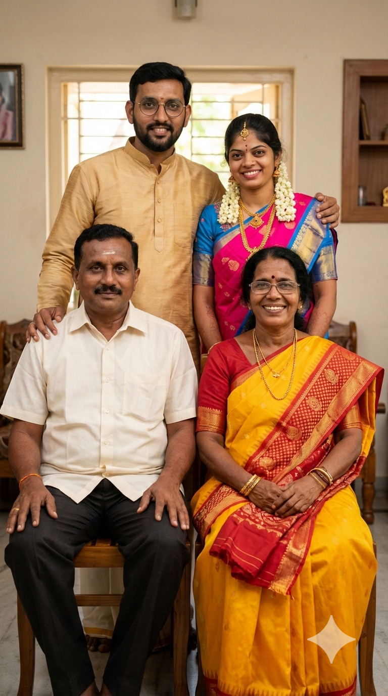 “A warm Indian family portrait of four people inside a simple home setting. An elderly grandfather wearing a light cream traditional shirt and dark trousers sitting on a chair, beside an elderly grandmother wearing a yellow saree with a red patterned pallu and traditional jewelry. Behind them stands a young couple smiling happily – the man wearing a golden kurta with glasses and trimmed beard, and the woman wearing a bright pink saree with blue border, traditional jewelry, and flowers in her hair. Natural indoor lighting, candid family moment, vibrant colors, high detail, realistic skin tones, DSLR quality, soft shadows, sharp focus, heartwarming atmosphere, vertical composition, 4k resolution.” 9:16 ratio Note : Don’t Change The Upload photo faces