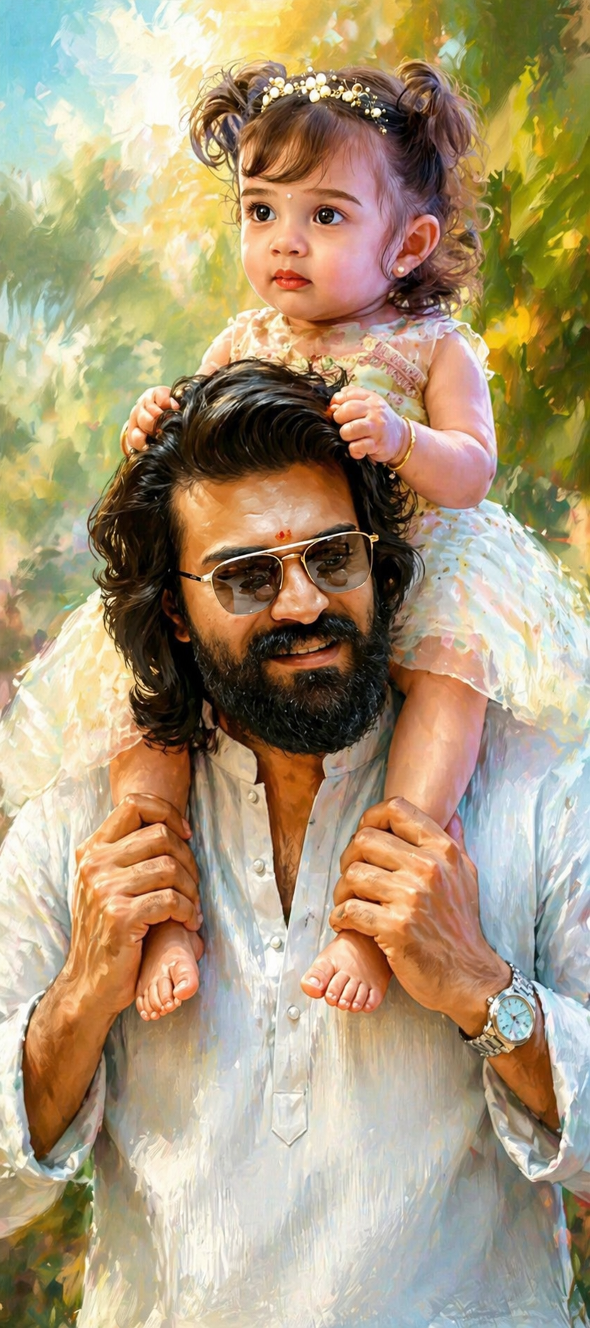 Use my uploaded photo as the exact face reference (STRICT FACE PRESERVATION – keep 100% identical facial features, skin tone, hairstyle, and natural expression. Do not alter or stylize the face). Create a vibrant semi-realistic digital painting/illustrated portrait of a happy father carrying his young daughter on his shoulders 9:16 Ratio 4k qoulity