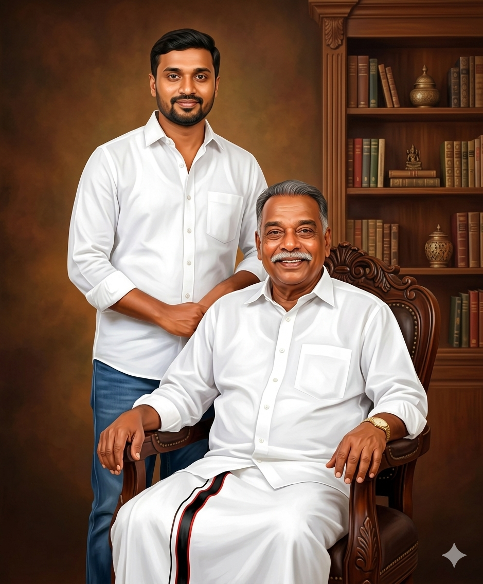 A realistic digital painting of two South Indian men in a royal indoor setting, one senior man sitting on an elegant carved wooden chair wearing a white shirt and traditional white veshti with black and red border, smiling confidently, thick mustache, gold watch, relaxed pose with one hand on armrest.