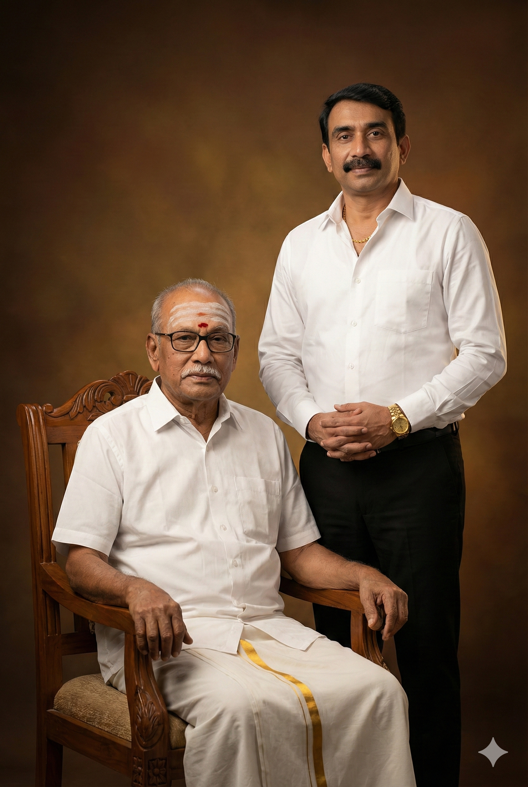 A realistic cinematic portrait of an Indian father and son. The elderly father is seated on a classic wooden chair, wearing a traditional white dhoti with a golden border and a white short-sleeve shirt, sacred ash (vibhuti) on his forehead, calm and dignified expression. The son stands beside him confidently, wearing a white formal shirt, black trousers, gold chain and wristwatch, hands gently clasped. Warm studio lighting, soft cinematic shadows, brown–gold gradient background, emotional family bond, cultural elegance, ultra-realistic skin texture, sharp focus, DSLR quality, 85mm lens look, shallow depth of field, high detail, professional studio photography, cinematic color grading.