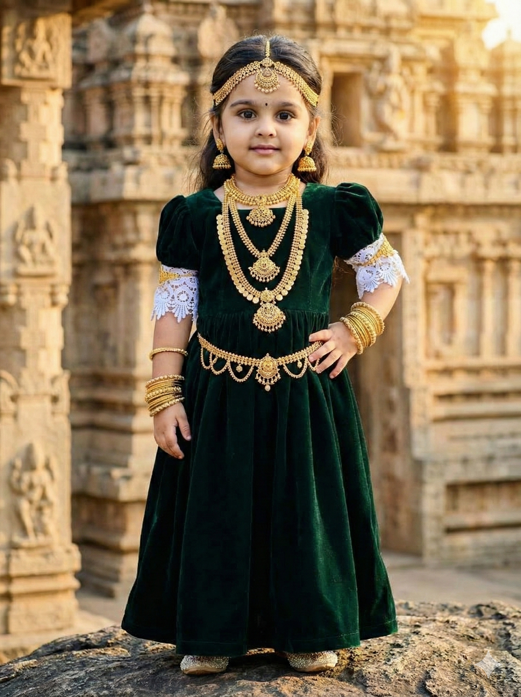 Photorealistic historic full-body portrait of a young girl in uploaded image, hair with gold hair ornament maang tikka. seeing directly at the viewer with slight smile. She is wearing a dress in second image. She is lavishly adorned with multiple intricate gold necklaces, large gold jhumka earrings, gold armlets, gold bangles, and a detailed gold belly chain. She stands on rock surface with elegantly, with one hip slightly pushed out, Note Don’t Change The Upload Photo Faces