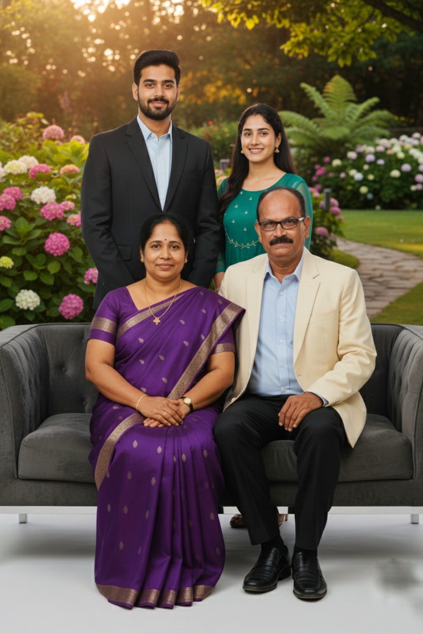 “Create a highly realistic luxury family studio portrait in 9:16 ratio.