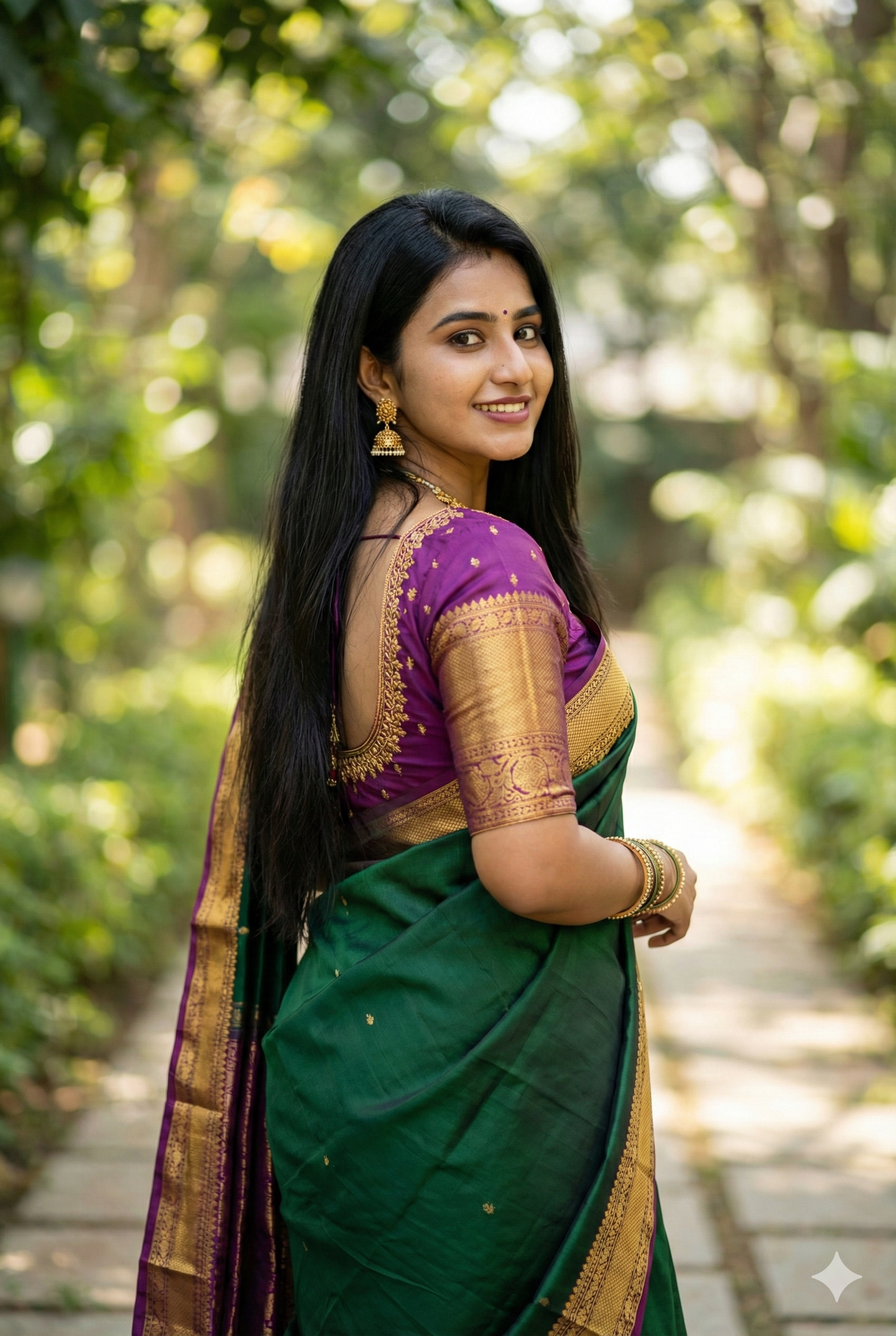A beautiful South Indian woman wearing a traditional silk saree, deep green saree with a rich purple blouse featuring gold zari borders, long straight black hair flowing down her back, small bindi on her forehead, gold earrings and bangles, soft natural makeup, smiling gently while looking back over her shoulder, candid outdoor portrait, garden pathway background with lush greenery, soft natural daylight, shallow depth of field, creamy bokeh effect, cinematic photography, DSLR photo, 85mm lens, ultra-realistic, high detail skin texture, warm tones, elegant and graceful pose