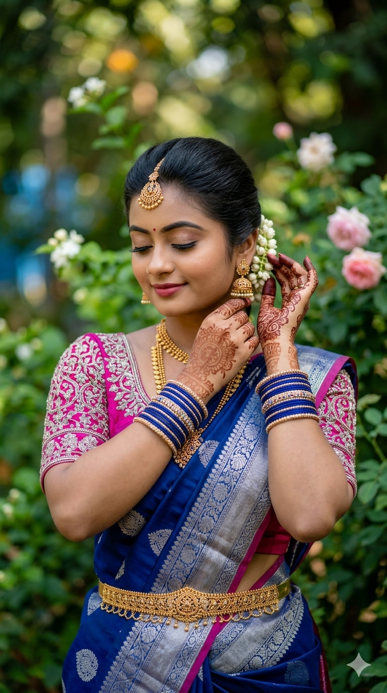 Ultra-realistic 8K portrait of a young Indian woman wearing a traditional blue saree with silver border and pink blouse, medium shot, standing outdoors in a lush green background with smooth bokeh. She has a gentle smile with eyes closed, expressing a calm and happy mood. Both hands are raised near her ears in a graceful pose. Traditional jewelry including gold maang tikka, necklace, waist belt (vaddanam), and multiple blue bangles. Mehndi design visible on her hands. Natural soft lighting, vibrant colors, shallow depth of field, DSLR quality, cinematic color grading, sharp focus on subject, background blurred, high detail skin texture, realistic fabric folds, elegant composition, 85mm lens, f/1.8 aperture.9:16 Ratio full smile and kissing flower’s