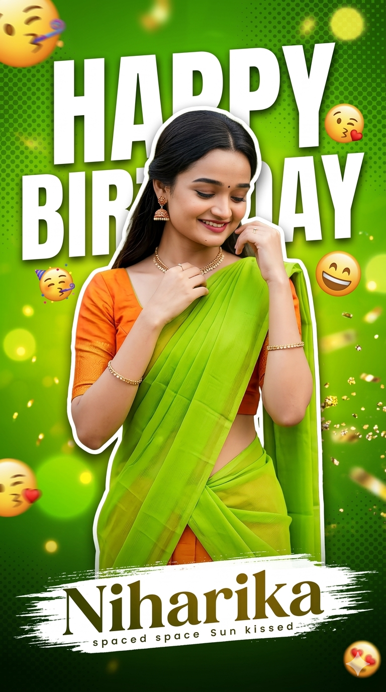 A stylish birthday poster design, beautiful young Indian girl wearing a bright green saree with orange blouse, smiling and looking down shyly, long straight black hair, traditional earrings, elegant pose holding saree pallu, studio lighting, vibrant green gradient background with halftone dot texture, large bold white text “HAPPY BIRTHDAY” behind the model, soft glow lighting, floating party emoji elements with motion blur, modern poster design, high contrast colors, sharp focus, cinematic lighting, professional birthday banner style, white outline cutout around the girl, bottom text “Niharika” in stylish spaced Sun kissed font, Brush stroke effect name Backside ultra detailed, 4k, poster design, vertical composition –ar 9:16