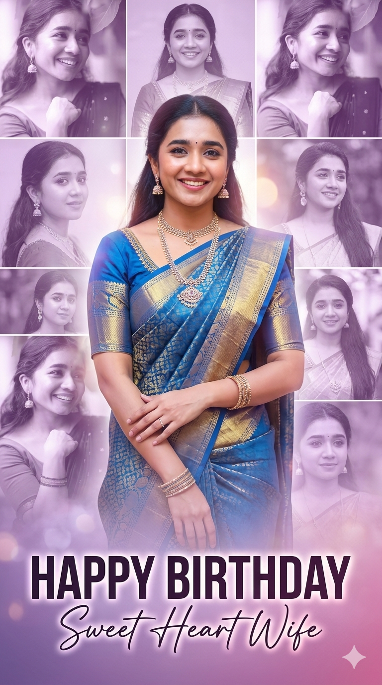 A beautiful Indian young woman wearing a traditional silk saree (blue and gold combination), elegant jewelry, smiling naturally, standing in the center. Background filled with a collage grid of her multiple portrait photos in soft purple monochrome tones. Center subject in full color with high sharpness and glow effect. Soft dreamy lighting, smooth skin tones, cinematic color grading, purple-pink gradient overlay at bottom with mist/fog effect. Stylish birthday poster design.