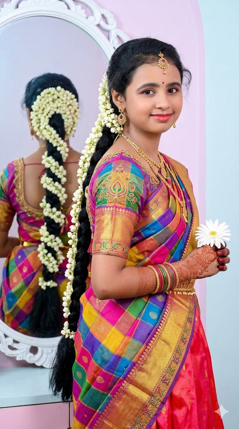 “A beautiful 15-year-old South Indian girl wearing a traditional half-saree (langa voni), bright silk langa and colorful voni with golden border, long thick braided hair decorated with jasmine flowers (gajra). She is standing gracefully in a studio, her long braid falling behind her back. A decorative mirror behind her shows the reflection of her braid. The girl looks elegant and traditional with small bindi, light gold jewelry, bangles and earrings. Soft smile, traditional Telugu oni function look. Clean CDP style plain studio background with soft pastel colors, soft lighting, ultra realistic, high detail, portrait photography, 85mm lens, shallow depth of field, cinematic lighting, 9:16 ratio.”