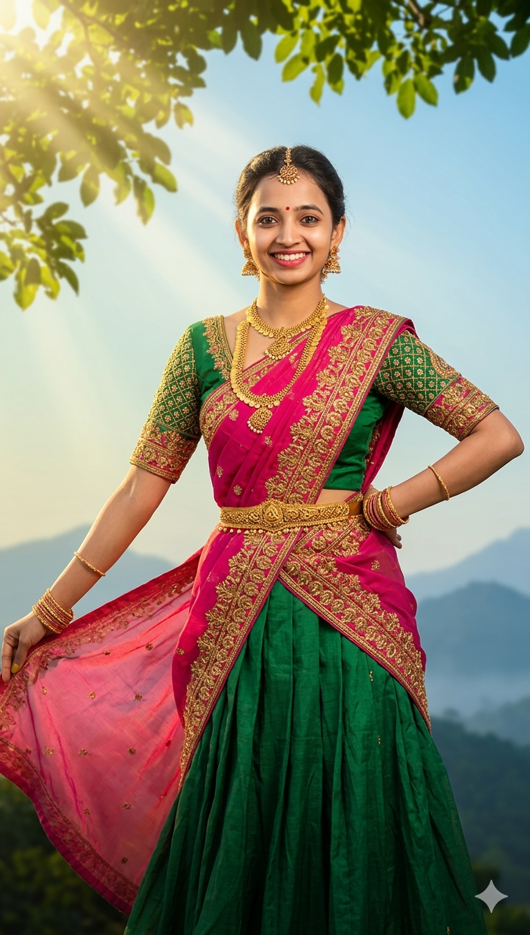 A beautiful young Indian girl wearing a traditional half-saree (Langa Voni) in green and pink colors with rich golden embroidery, heavy traditional gold jewelry including necklace, bangles, waist belt, earrings and head ornament, small red bindi, traditional makeup, smiling face. She is standing in a graceful dance pose, one hand on her waist and the other hand holding and spreading the pink dupatta sideways. Traditional Bharatanatyam style posture. Background with soft blue sky gradient, distant mountains and misty landscape, bright golden sunlight rays coming through green leaves from the top corner, dreamy cinematic lighting, vibrant colors, high detail, studio quality, soft focus background, ultra realistic, 4k portrait photography. Note One eys close one Eyes open pose
