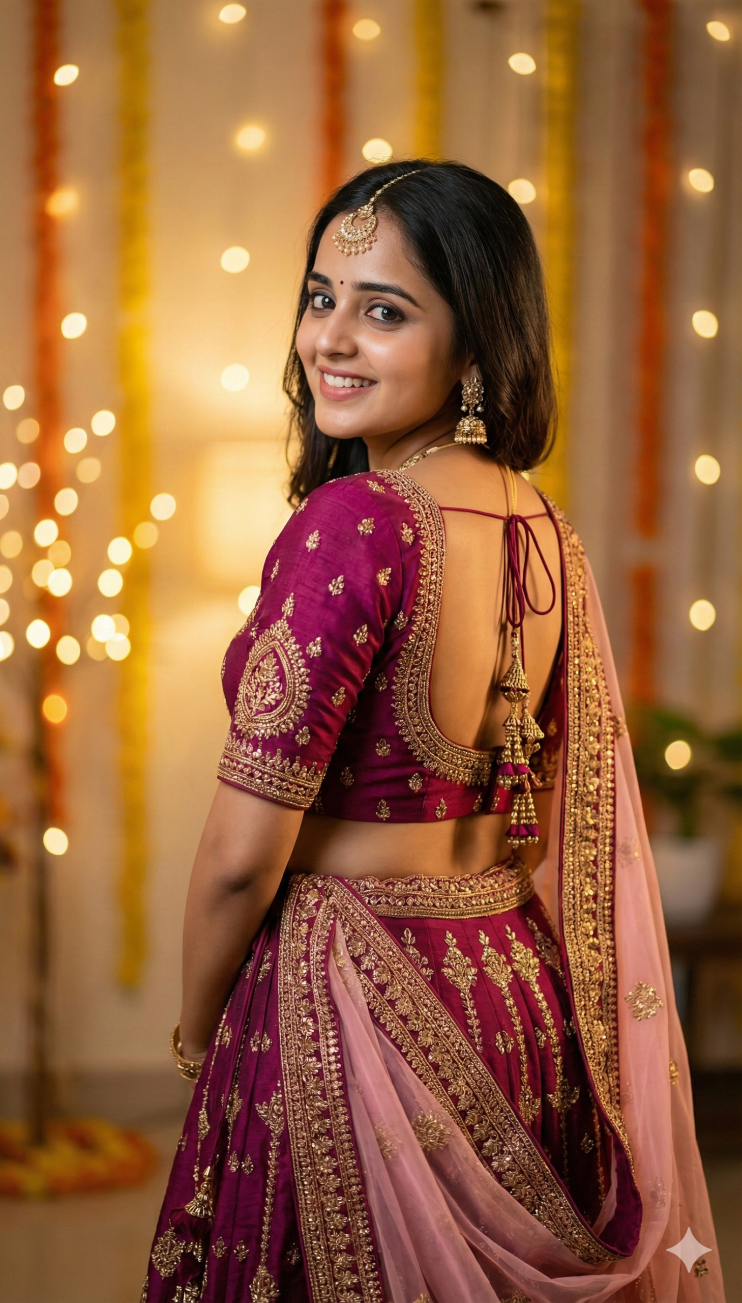 A beautiful Indian woman wearing a traditional deep magenta lehenga choli with intricate gold embroidery, back-facing pose while turning her head and smiling at the camera. Elegant open-back blouse with dori tassels, soft pink dupatta draped gracefully. She is adorned with minimal traditional jewelry, maang tikka and earrings. Warm indoor lighting with a golden bokeh background, cinematic portrait photography, shallow depth of field, ultra-realistic skin texture, natural smile, festive wedding look, high detail fabric texture, professional DSLR photo, 85mm lens, f/1.8, soft glow, royal Indian aesthetic, 4K quality