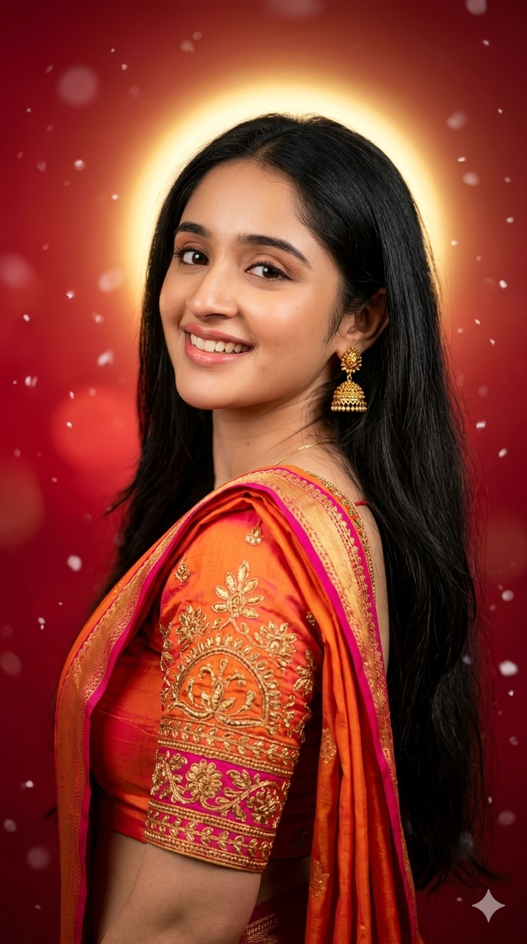 A beautiful young Indian woman in a traditional saree, side pose looking back with a bright smile, wearing a vibrant orange and pink blouse with intricate embroidery, elegant gold jhumka earrings, long smooth black hair flowing, soft natural makeup, warm skin tones, centered composition, glowing golden halo light behind her, surrounded by a rich red gradient background with soft bokeh and floating white particles like snow, cinematic lighting, high detail, ultra realistic, 8k resolution, sharp focus, studio portrait style, soft glow effect, depth of field, festive mood