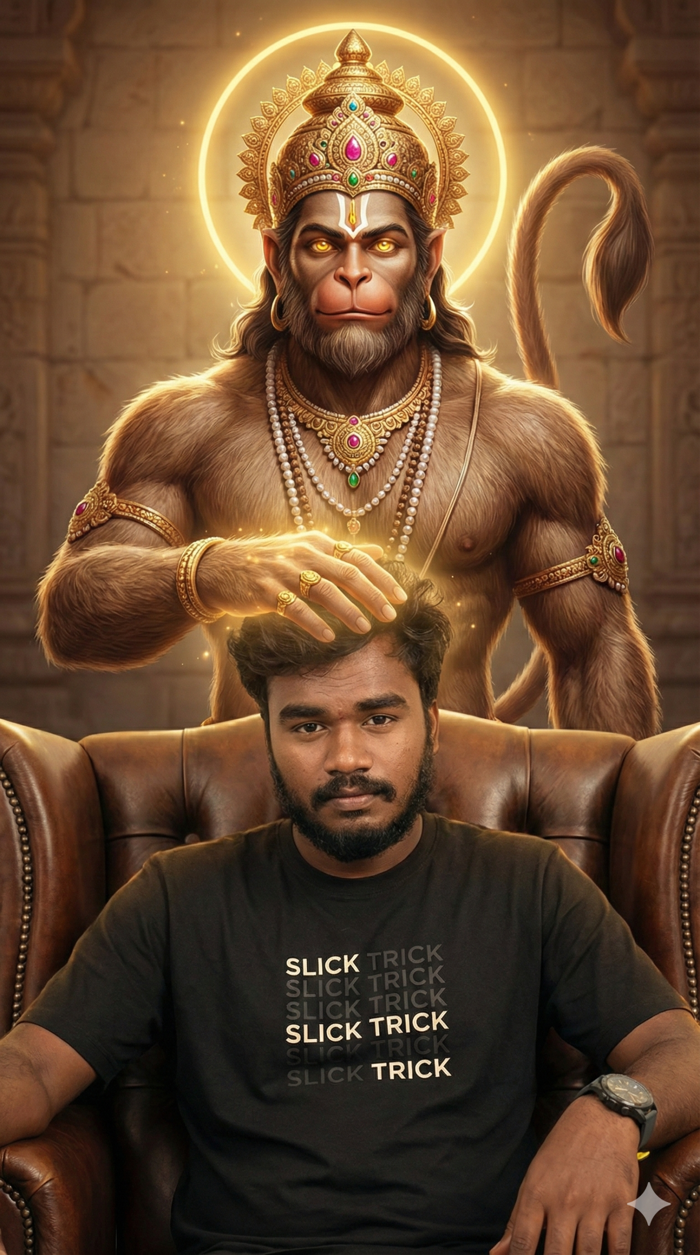 A powerful cinematic portrait inspired by Hindu mythology. Lord Shiva stands majestically behind a modern Indian man seated confidently on a leather chair. Hanuman appears in a divine anthropomorphic form with muscular build, detailed fur texture, glowing golden eyes, ornate golden crown and jewelry, sacred tilak on his forehead, and a radiant halo of divine light behind his head. His right hand rests gently on the man’s head in a blessing gesture, emitting a soft golden spiritual aura.