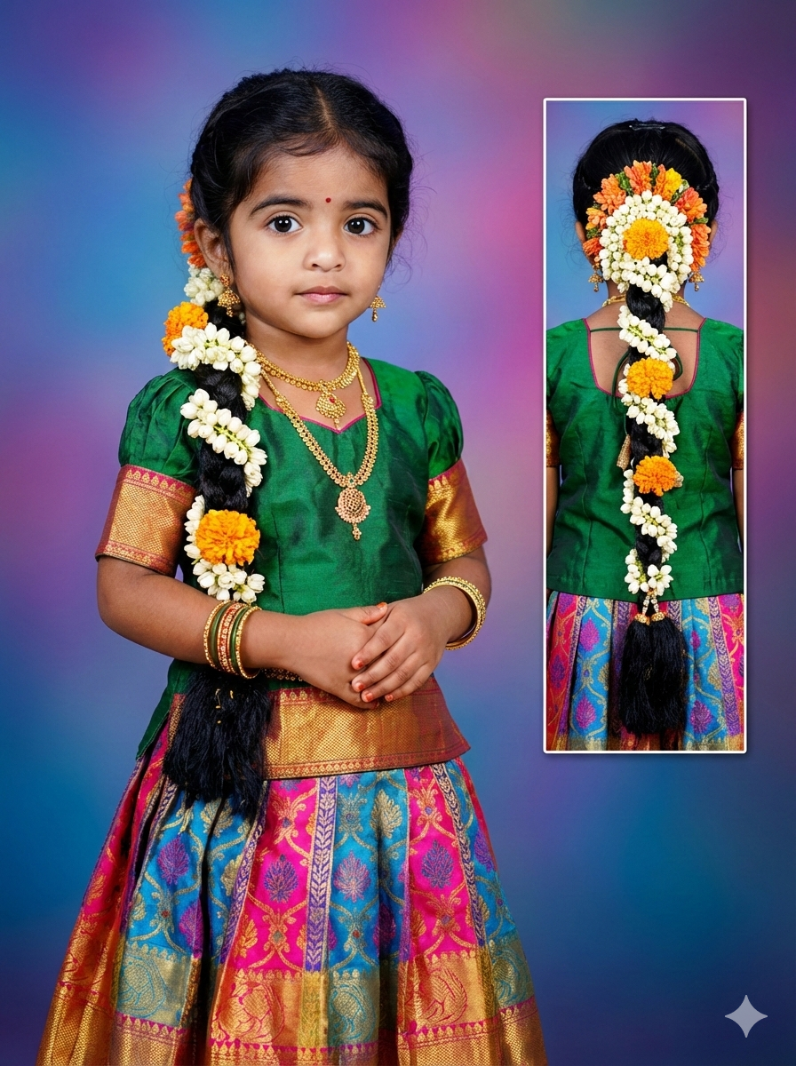 “Ultra-detailed studio portrait of a cute South Indian little girl wearing a traditional green silk blouse and colorful pattu lehenga with rich golden zari border. The child is standing with hands gently folded, big expressive eyes, small red bindi, traditional gold jewelry including necklace, bangles and earrings. Hair styled in a long traditional braid decorated with jasmine and marigold flowers (poola jada). Bright festive ethnic outfit with vibrant pink, blue, and gold patterns. Soft studio lighting, smooth colorful gradient background (blue, purple, pink tones), high-end portrait photography, 85mm lens, shallow depth of field, ultra sharp focus, vibrant colors, professional Indian cultural photoshoot. Beside her a vertical inset frame showing the back view of the girl highlighting the long floral braid decoration. cinematic lighting, 8k, photorealistic, highly detailed, studio quality.”