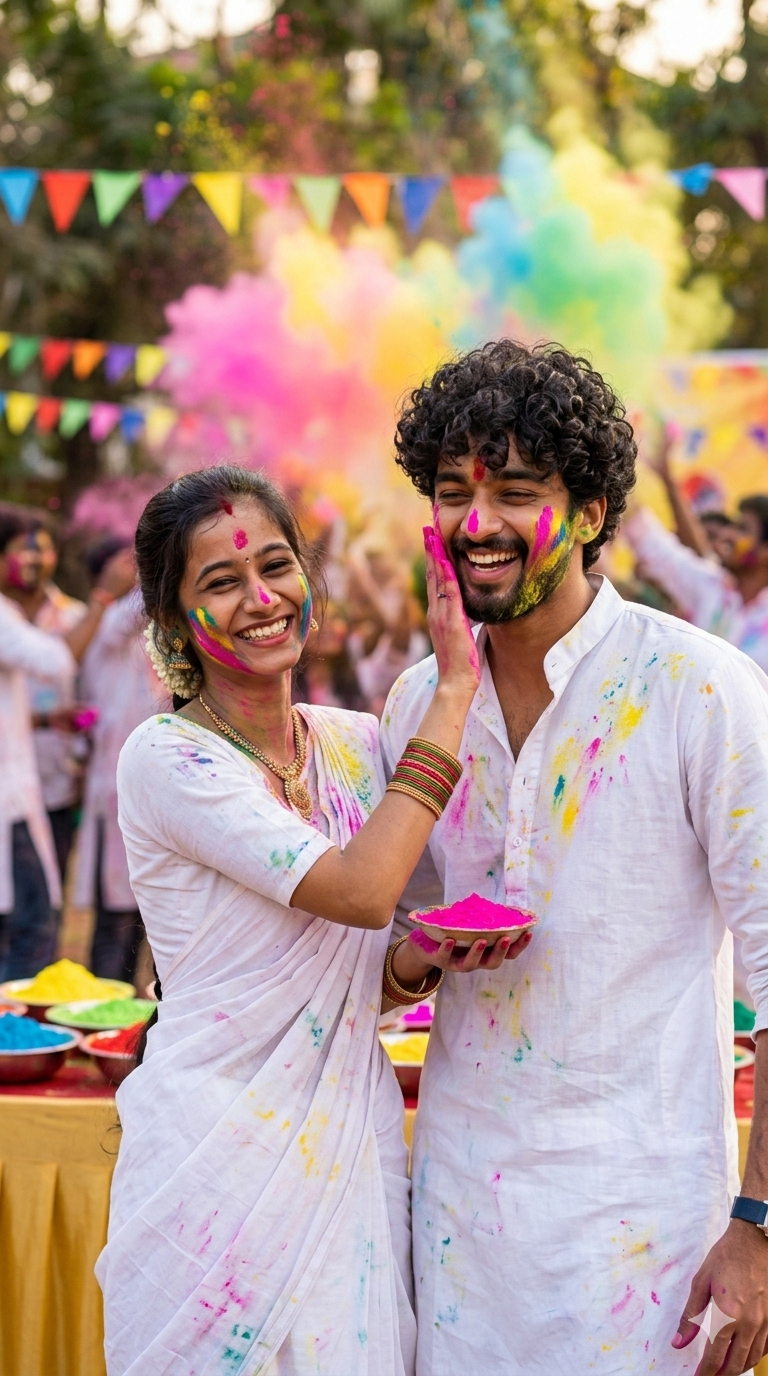 - Romantic Embrace: Couple embracing, faces covered in gulal, with a blurred festive background.