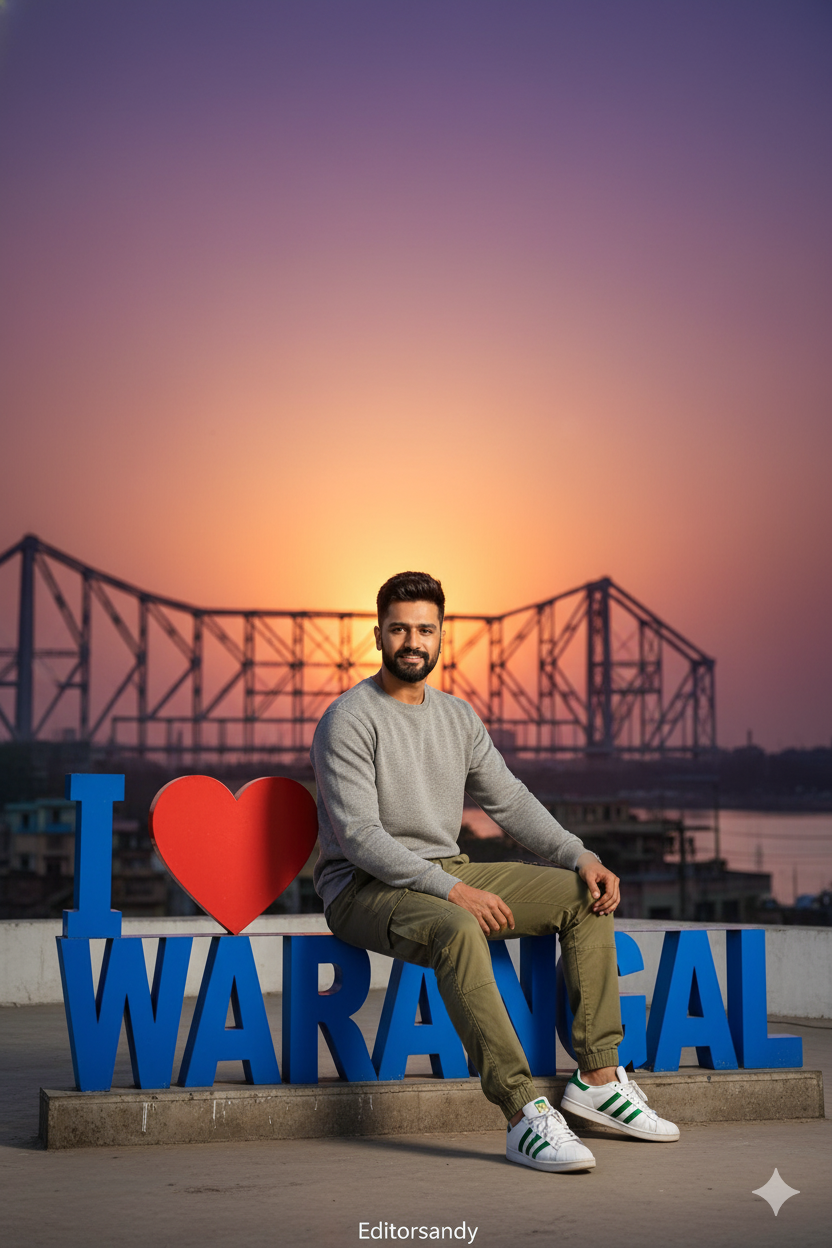 Photorealistic 8K cinematic portrait of a young man (same reference face), little smile, sharp features, goatee, side-parted quiff. Sitting on blue “I ❤️ WARANGAL” letters at golden hour. Wearing sweatshirt, olive-green cargos, white Adidas Stan Smiths. Eastern India rooftop behind beautiful howrah Bridge at sunset, purple–orange sky, HDR lighting, shallow depth, golden rim light. @editorsandy