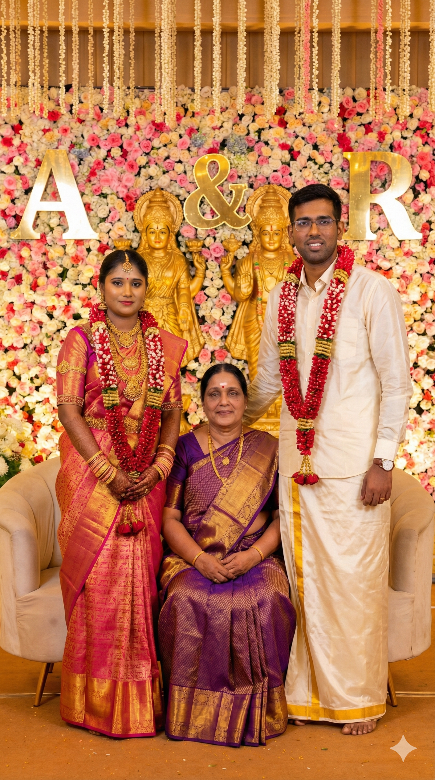 “Traditional South Indian wedding stage portrait, bride wearing pink and gold silk saree with heavy gold jewelry, groom wearing cream traditional dhoti and shirt with flower garland, elderly woman sitting in center wearing purple and gold silk saree, all wearing wedding garlands, standing and sitting pose for family wedding photo, bright pink floral wall background with hanging white and pink flowers, golden Hindu deity statues behind, decorative wedding initials letters on backdrop, professional studio lighting, ultra realistic, high detail, sharp focus, 85mm portrait photography, vibrant colors, Indian wedding photography style” 9:16 ratio