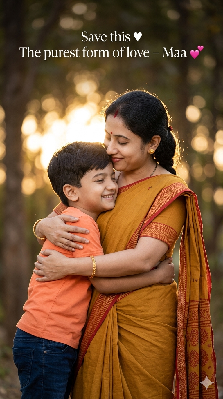 A heartwarming emotional scene of an Indian mother lovingly hugging her young son outdoors, both smiling with eyes closed, expressing pure love and comfort. The mother is wearing a traditional mustard-yellow saree with red border, a red bindi on her forehead, gold earrings and bangles, soft natural makeup, and neatly tied hair. The little boy is wearing an orange t-shirt and dark jeans, hugging her tightly with joy.