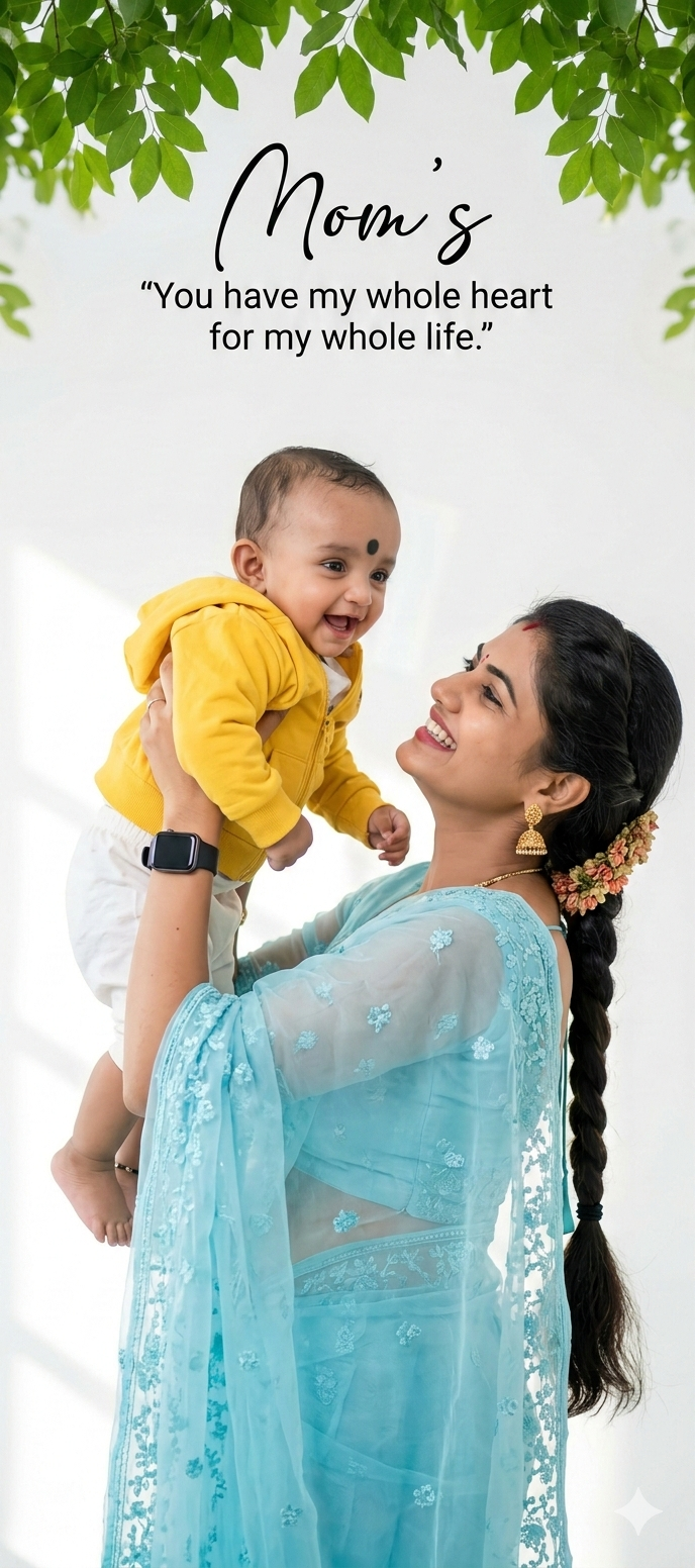 Beautiful Indian mother holding her cute little child in the air, emotional loving moment, mother wearing a light blue transparent embroidered saree with long braided hair, small bindi, elegant earrings, smartwatch, smiling warmly at her child, cute toddler wearing bright yellow jacket and white pants, mother and child looking at each other happily, soft natural lighting, clean white studio background, minimal aesthetic composition, green fresh leaves hanging from the top frame, Mother’s Day theme, text on top “Mom’s” in stylish handwritten typography and quote “You have my whole heart for my whole life”, ultra realistic, high detail, soft shadows, pastel color tones, professional portrait photography, 85mm lens, shallow depth of field, 8k, cinematic look