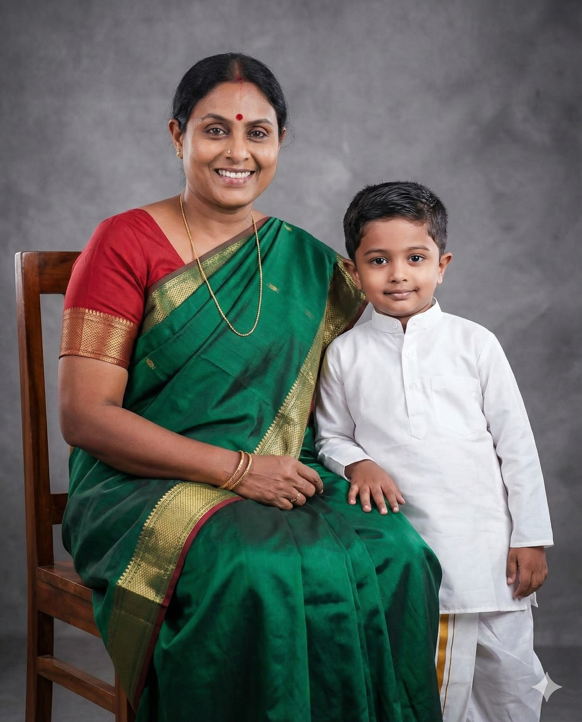 A heartwarming studio portrait of an Indian grandmother and her young grandson, traditional South Indian style. The grandmother is seated on a chair, wearing a rich green silk saree with golden zari border, minimal gold jewelry, small red bindi, warm gentle smile. The little boy is standing beside her, slightly leaning on her knee, wearing a white traditional kurta and dhoti, short neatly combed hair, innocent smile. Soft studio lighting, neutral grey textured background, natural skin tones, sharp focus, ultra-realistic details, professional portrait photography, DSLR quality, shallow depth of field, 4K resolution, cultural Indian family emotion, calm and elegant composition