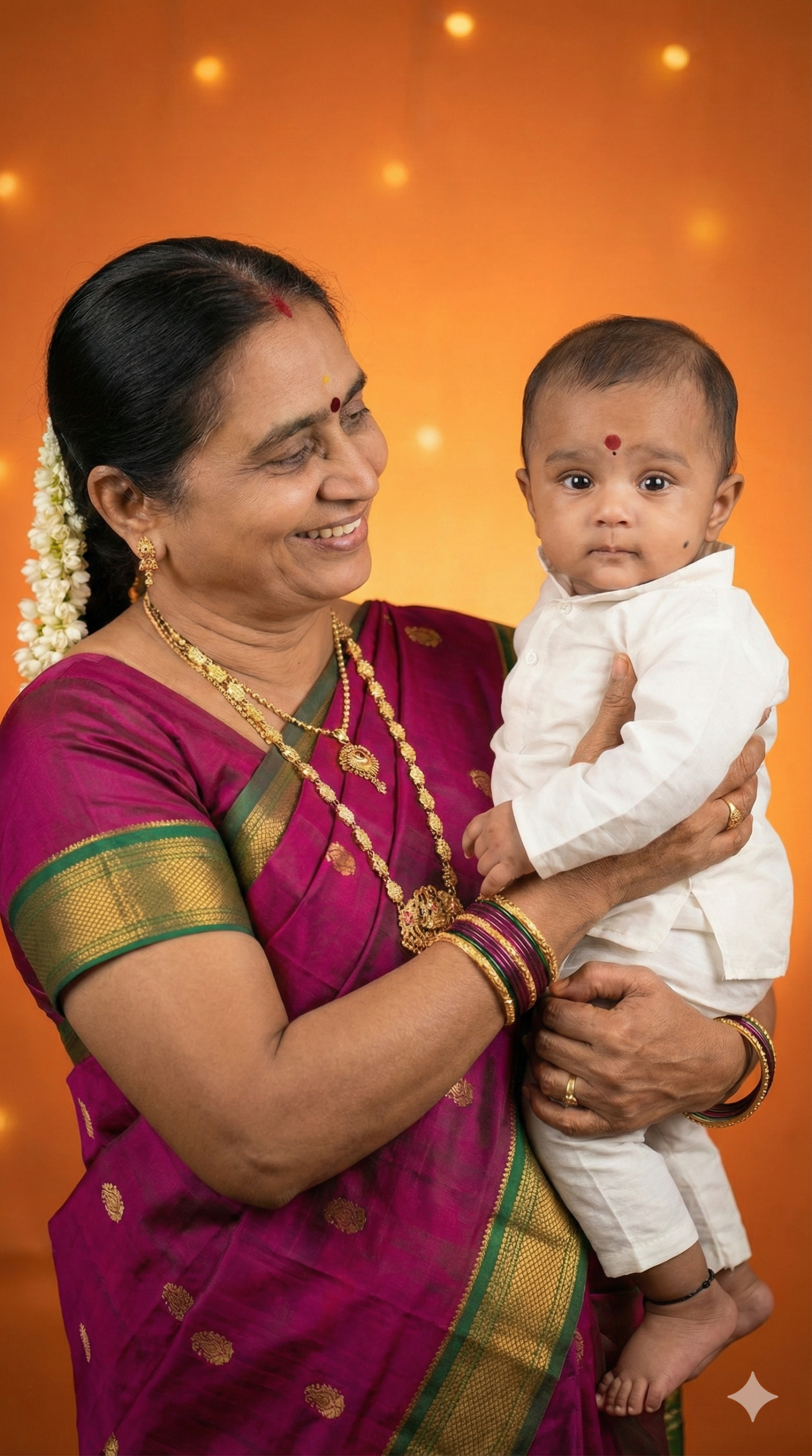 A warm and emotional studio portrait of an Indian grandmother holding her baby grandchild. The elderly woman is wearing a rich magenta silk saree with a green and gold border, traditional gold jewelry, small red bindi, neatly tied hair with flowers, and a gentle, proud smile. She lovingly holds a chubby baby dressed in a simple white traditional outfit, the baby looking calmly at the camera. Soft professional studio lighting highlights their faces and skin tones. Background is a smooth orange gradient with subtle bokeh, giving a festive and traditional Indian feel. Ultra-realistic photography, sharp focus, natural skin texture, DSLR quality, 85mm lens, shallow depth of field, cinematic warmth, high resolution, emotional family portrait, cultural elegance. Note :Don’t Change The Upload photo faces