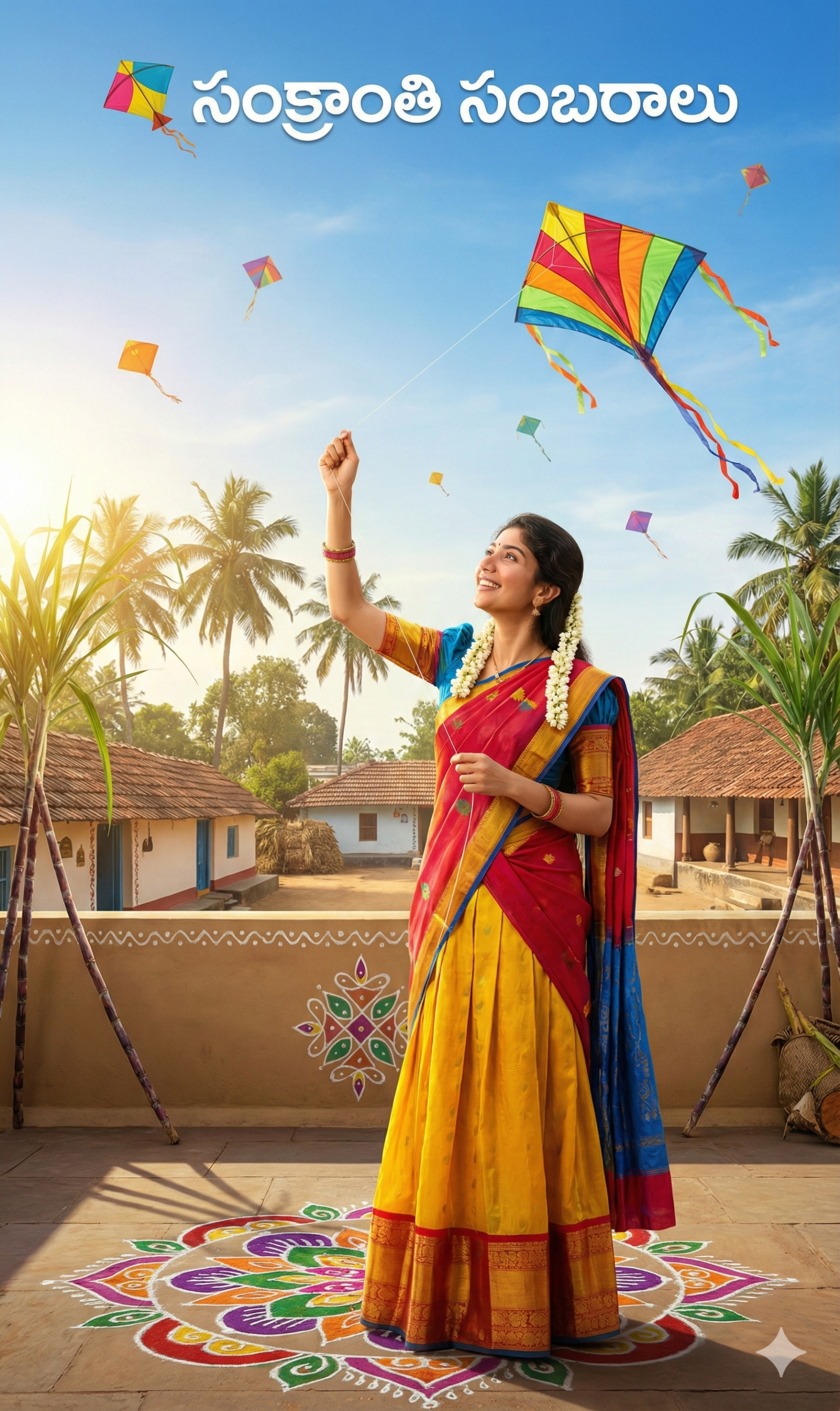 A beautiful Telugu village scene during Sankranti festival. A young Telugu girl wearing a colorful traditional half-saree (langavoni), jasmine flowers in her hair, standing on a village house terrace (inti paiki), joyfully flying a colorful kite in the blue sky. Bright morning sunlight, festive atmosphere, other kites flying in the sky, sugarcane decorations, rangoli on the terrace floor, coconut trees in background. Cinematic realistic photography style, ultra-detailed, natural skin tones, joyful expression, warm colors, Indian rural vibe, high resolution, shallow depth of field.Optional Telugu Text (Top of Image):🪁 సంక్రాంతి సంబరాలుor🪁 మన తెలుగు ఆడపిల్ల సంక్రాంతి ఆనందం