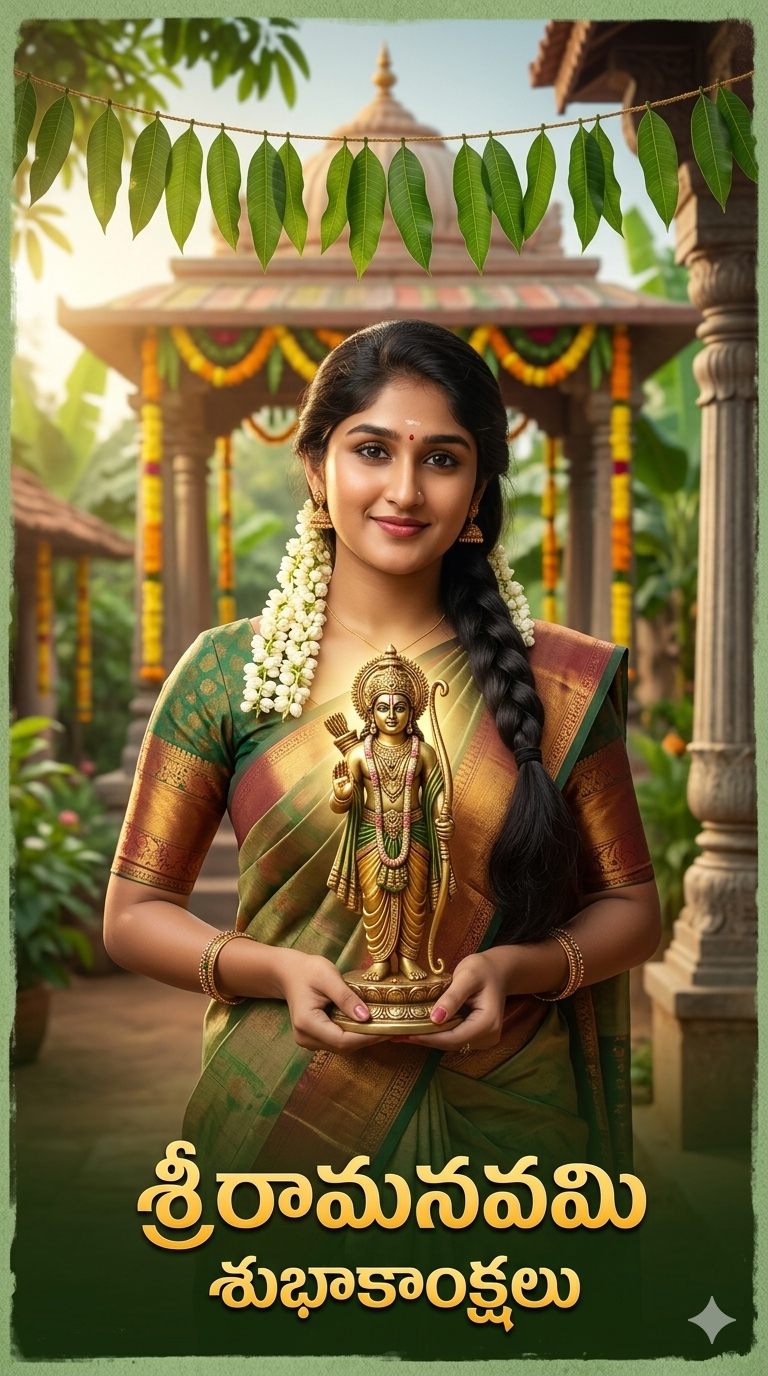 Background: authentic Indian village festive environment with a decorated mandapam, mango leaf toranam, temple-style pillars, traditional Sri Rama Navami decorations, rangoli on the ground, warm festive atmosphere. Add lush greenery elements around — soft green leaves, plants, subtle green color grading tones, giving a fresh natural village vibe.
