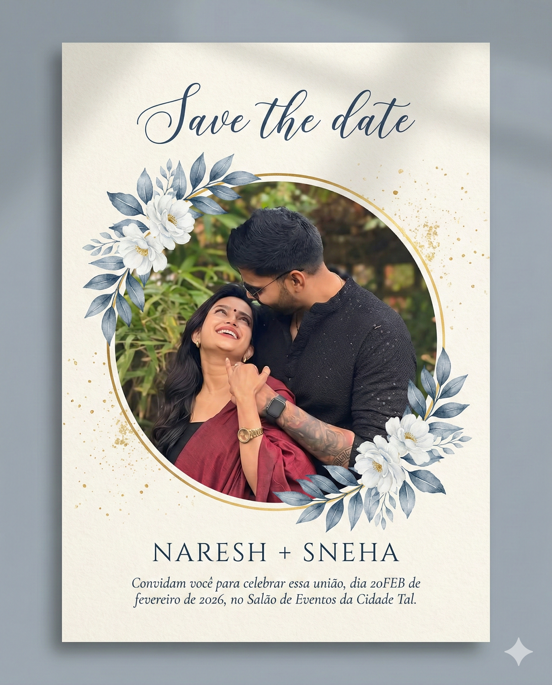 Elegant wedding “Save The Date” invitation card design, soft cream textured background with gold dust splash accents, circular photo frame in center with thin gold ring border, romantic couple hugging and smiling inside circle, decorative blue-grey watercolor leaves and white flowers arranged around top-left and bottom-right of circle, minimal luxury floral theme, soft shadow depth, premium stationery style, high resolution, studio lighting, clean layout.