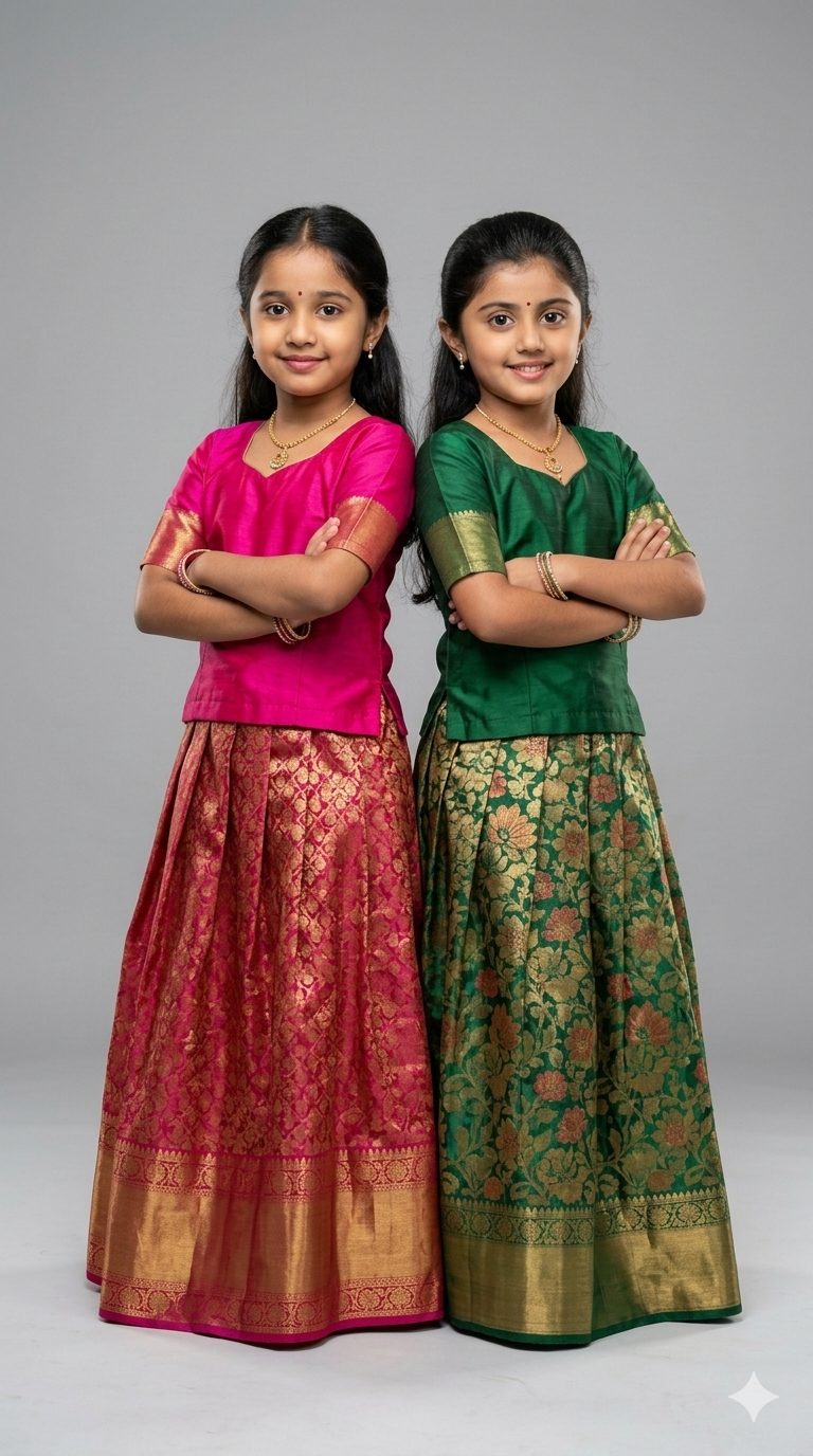 A high-resolution studio portrait of two cute Indian little girls standing confidently side by side with folded arms, wearing traditional South Indian silk lehenga outfits. One girl is wearing a bright pink blouse with a rich pink and gold brocade long skirt, the other girl is wearing a deep green blouse with a green and gold floral brocade long skirt. Both girls have traditional jewelry including small necklaces, bangles, earrings, and small bindis on their foreheads. Their hair is neatly styled with center partition and tied back. They have a confident and cute expression while posing. Clean gray studio background, soft professional studio lighting, sharp focus, ultra-detailed fabric texture, vibrant colors, cultural traditional fashion photography, full body portrait, 85mm lens, f1.8, high resolution, photorealistic, symmetrical composition.