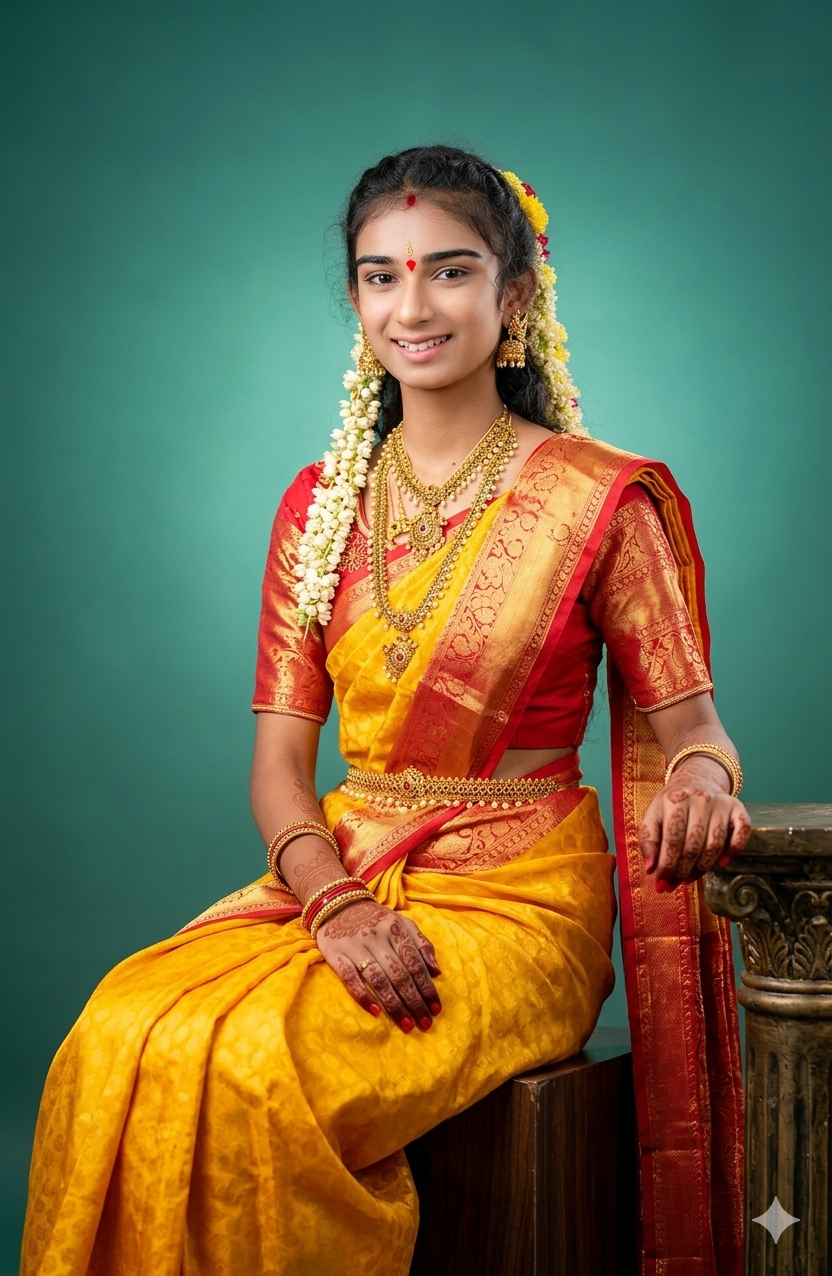 A beautiful South Indian young woman sitting in a studio portrait setup, wearing a bright yellow traditional saree with a red blouse and golden border. She is seated gracefully on a dark wooden block, with one hand resting on a pedestal and the other placed gently on her lap. She has long straight black hair, minimal makeup, and is wearing traditional gold jewelry including earrings, necklace, and bangles. Her expression is calm with a soft smile, looking directly at the camera.