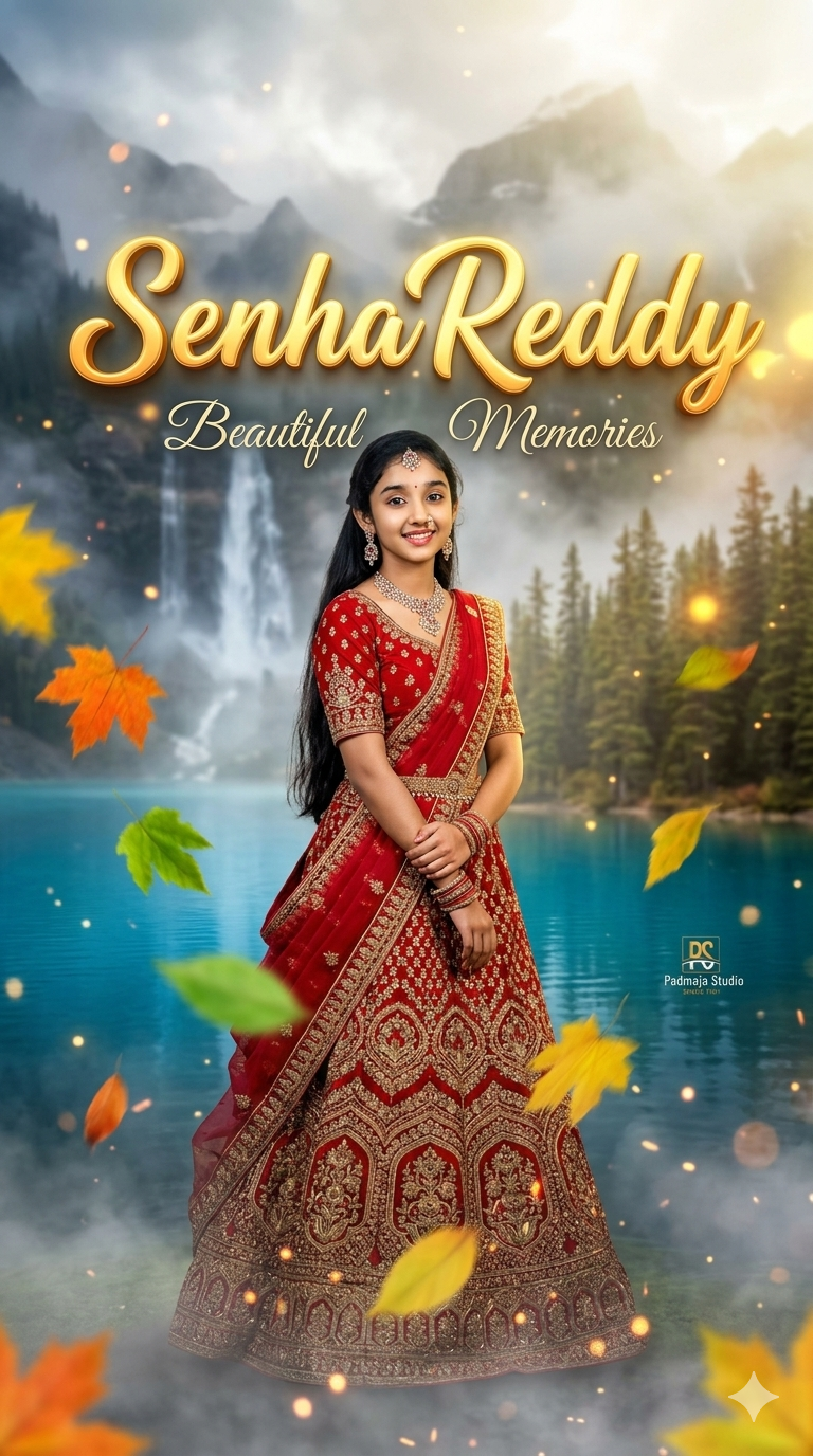 Text: large 3D golden cursive name “Varshitha” behind the subject, glowing effect, soft light reflections, with small subtitle “Beautiful memories” in elegant font.